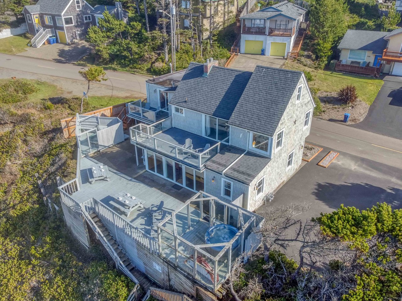 This unique oceanfront home makes it easy to enjoy the perfect coastal stay with friends and family who love gatherings but value their private space. Three distinct units with separate living spaces—one two-bedroom, one single-bedroom, and one studio, each with its own entry from outside, kitchen or kitchenette, bathroom, TV, and gas fireplace —share a huge oceanfront deck with panoramic views, a Weber grill, and a wind-screened hot tub! Each space has its own private entrance, making this a terrific way to share a vacation with multiple families. Nelscott Anchor House has been thoughtfully updated, but retains its historic 1940’s charm, with beadboard wainscoting, tile flooring, and an enchanting beamed, vaulted ceiling. Each level has its own deck and ocean view, with stairway access to the main-level deck, and a set of stairs down the cliff-face that gives you direct beach access. The Olivia Beach access is just down the street if you prefer a wider staircase, and it’s also just a short drive to Nelscott Beach and many other Lincoln City attractions. If you enjoy privacy, but want to share coastal time with a group of friends or family, Nelscott Anchor House provides an adorably retro space and fantastic ocean views for a memorable stay in Lincoln City!