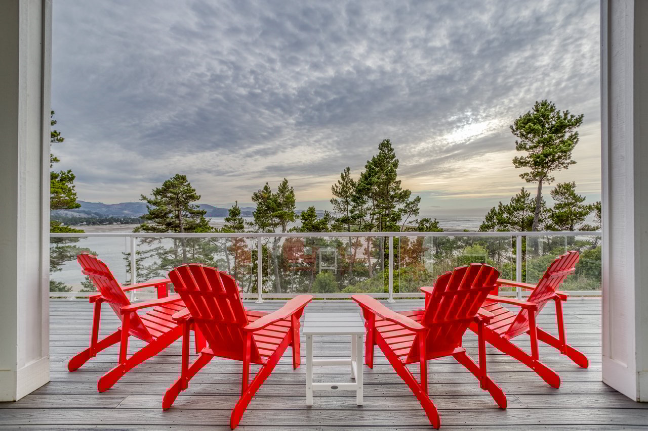 This outstanding home would be a stunner even if it weren’t perched on a promontory with panoramic views of Siletz Bay, the Salishan Spit, and the Pacific at the southwestern tip of the Taft district. But those two things together make it an extraordinary place to spend coastal time. Its luxury appointments, spacious, open rooms, four ensuite bedrooms, and stellar views from nearly every room will impress your guests and lend a relaxing aura to your stay. Our two sky-high decks, span the southern side of the home, inviting you to soak up the sun as you gaze through the tops of rugged shore-pines to bay, beach, sea, and sky.