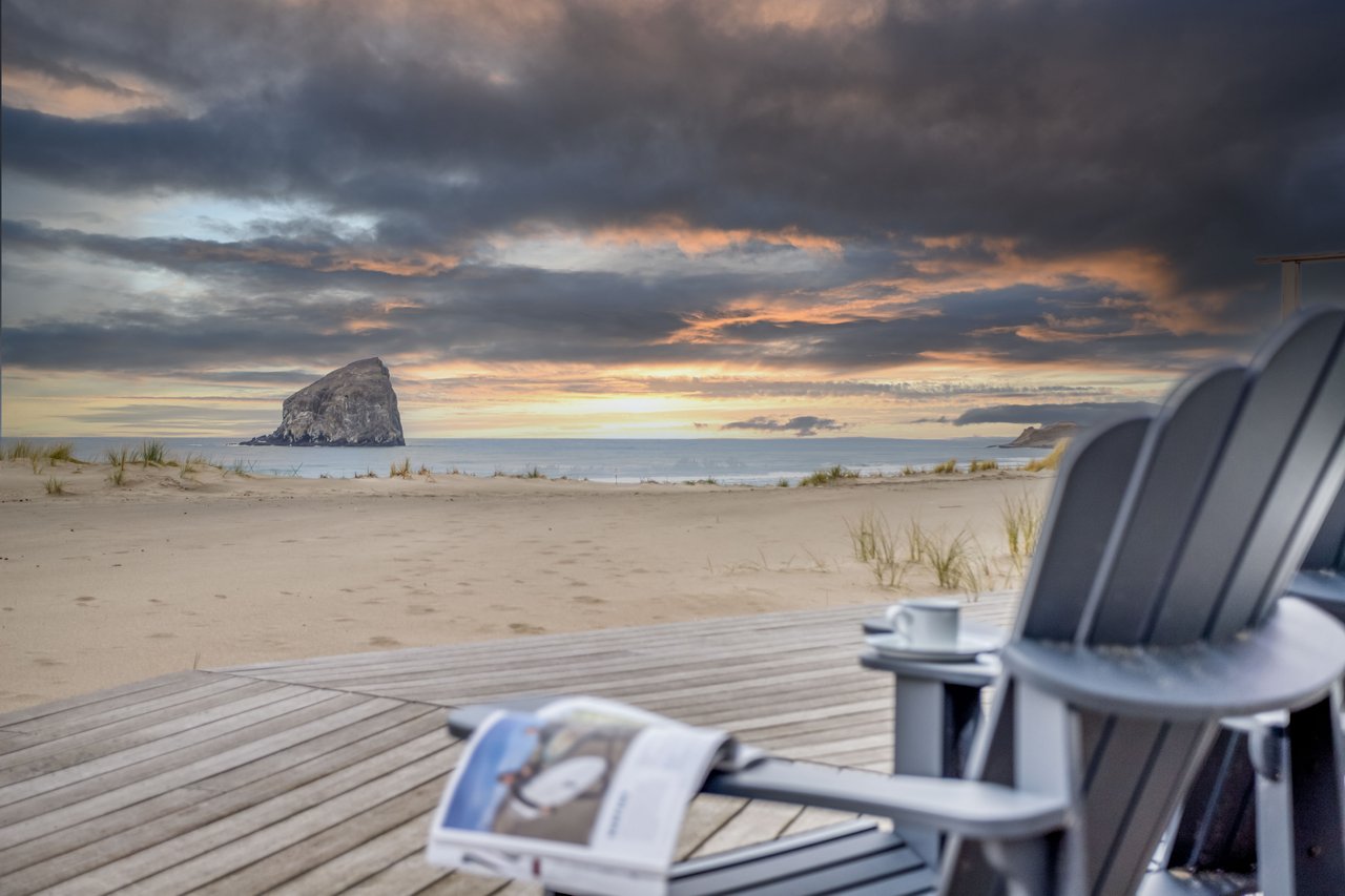Nothing gets in the way of your spirit lifting as you gaze at spectacular Haystack Rock and the beach at Pacific City through the sky-high windows of the pristine Pacific City Sand Dollar. Located in the gated community of Kiwanda Shore, this gorgeous, updated home puts you directly on the beach, with sand right off your deck and unobstructed coastal views to the north, south, and as far to the western horizon as your eye can see. You’re also an easy walk to Pacific City’s Cape Kiwanda, where you can drink an award-winning beer at the Pelican Pub, dine in luxury at the Meridian Restaurant, surf, search tidepools, see dory boats skim off the sea onto the sand, and enjoy people-watching on the beach.