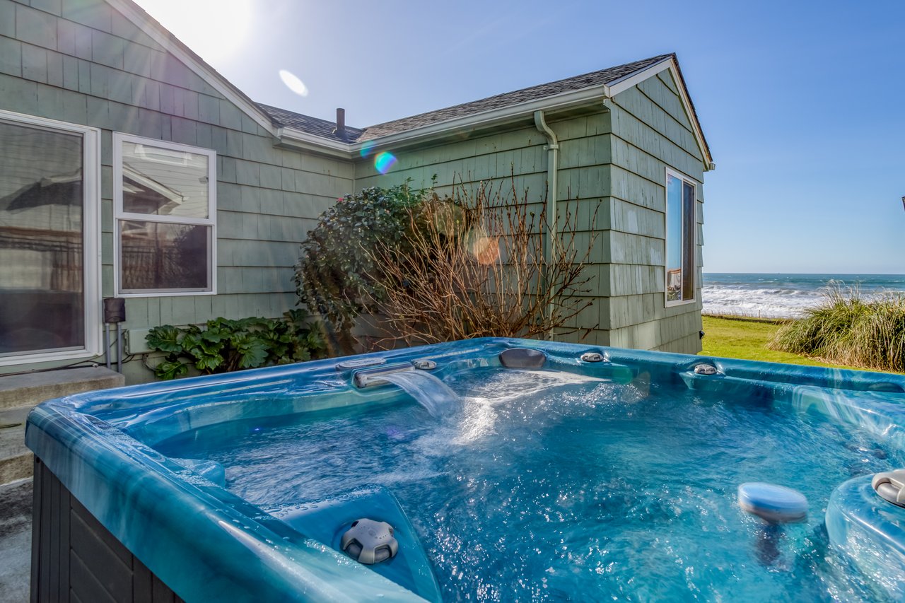 A bonus room with TV opens to a patio with table, chairs and a gas barbeque. A door from the living room takes you to a huge wooden deck for sunning behind a glass wind-screen wall. That area adjoins a vast expanse of lawn complete with Adirondack chairs for a sweeping view south to the rocks of Fogarty Creek Point and north to hazy Cascade Head, with a sparkling horizon of ocean, surf and sand in between. A concrete ramp from the property leads to a few stairs and a sandy slope right to the beach, so the kids can run seamlessly from games on the lawn to digging in the sand.