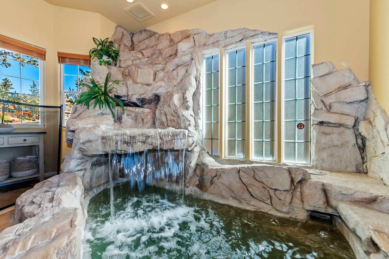 Inside, the open floor plan is designed to impress, with floor-to-ceiling windows showcasing breathtaking views. The living area features a heated indoor Grotto with a waterfall, a striking rock wall fireplace, and unparalleled lakefront views creating a focal point for gatherings. The fully equipped kitchen and sophisticated dining area make it easy to entertain and enjoy meals together in style.