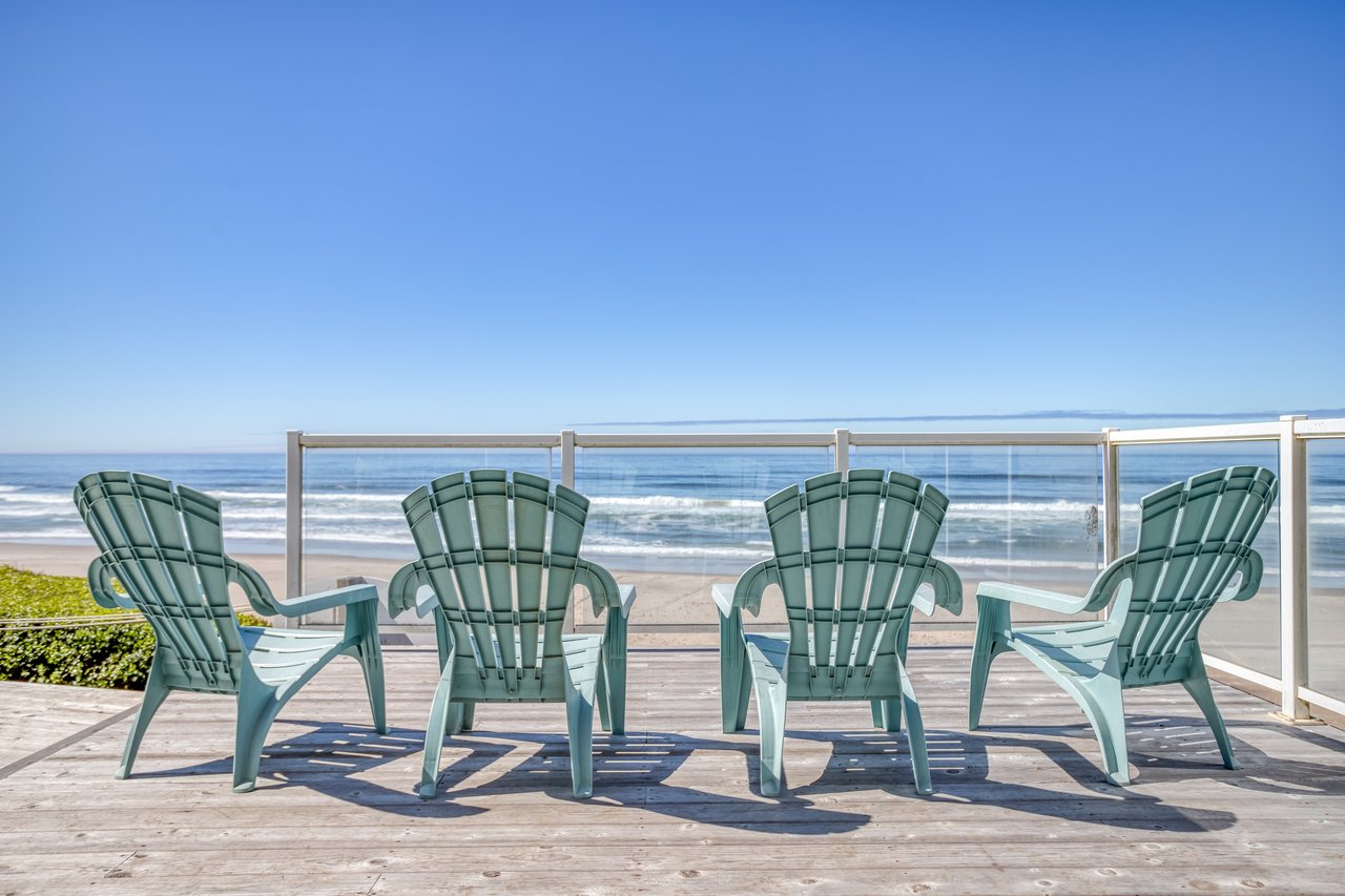 Like a breath of cool ocean air, Logan’s Lodge will refresh your senses and provide a fantastic setting for your time at the beach. Its setting above the Pacific puts you just three houses down from the entrance to Roads End State Park and easy access to sandy beach, tide pooling, wind-surfing and more. A huge deck spans the length of the home, with wide open views of the sand and surf below--and the whales, seals and seabirds cruising by. The main-floor great room, with gleaming hardwoods throughout, provides comfortable, contemporary sofas for enjoying the huge flat-screen TV/DVD player. A large dining table seats six, with a window seat for taking in the view. The updated kitchen has speckled granite counters, glass tile backsplash detail and stainless appliances, including a gas stove. A main-floor queen bedroom is roomy and accessible. The stairs to the upper floor feature a unique oculus window that will delight the kids--so will a bedroom with twin bunks and a second bedroom with four twin beds! There’s an additional queen bedroom, plus a queen suite and a queen bedroom with direct access to a shared bath--each with views of the ocean and their own flat-screen TVs. There’s a sweet, protected courtyard with chairs in front of the home, a gas barbecue for grilling, and a large tiled entryway and laundry room for your sandy forays to the beach. You’re a five-minute drive to the Chinook Winds Casino, golf, dining and shopping, and less than five minutes walking to the beach. Once you, your family and friends have tried the casual elegance and excellent location of Logan’s Lodge, you’ll be ready to book it for your next beach adventure.