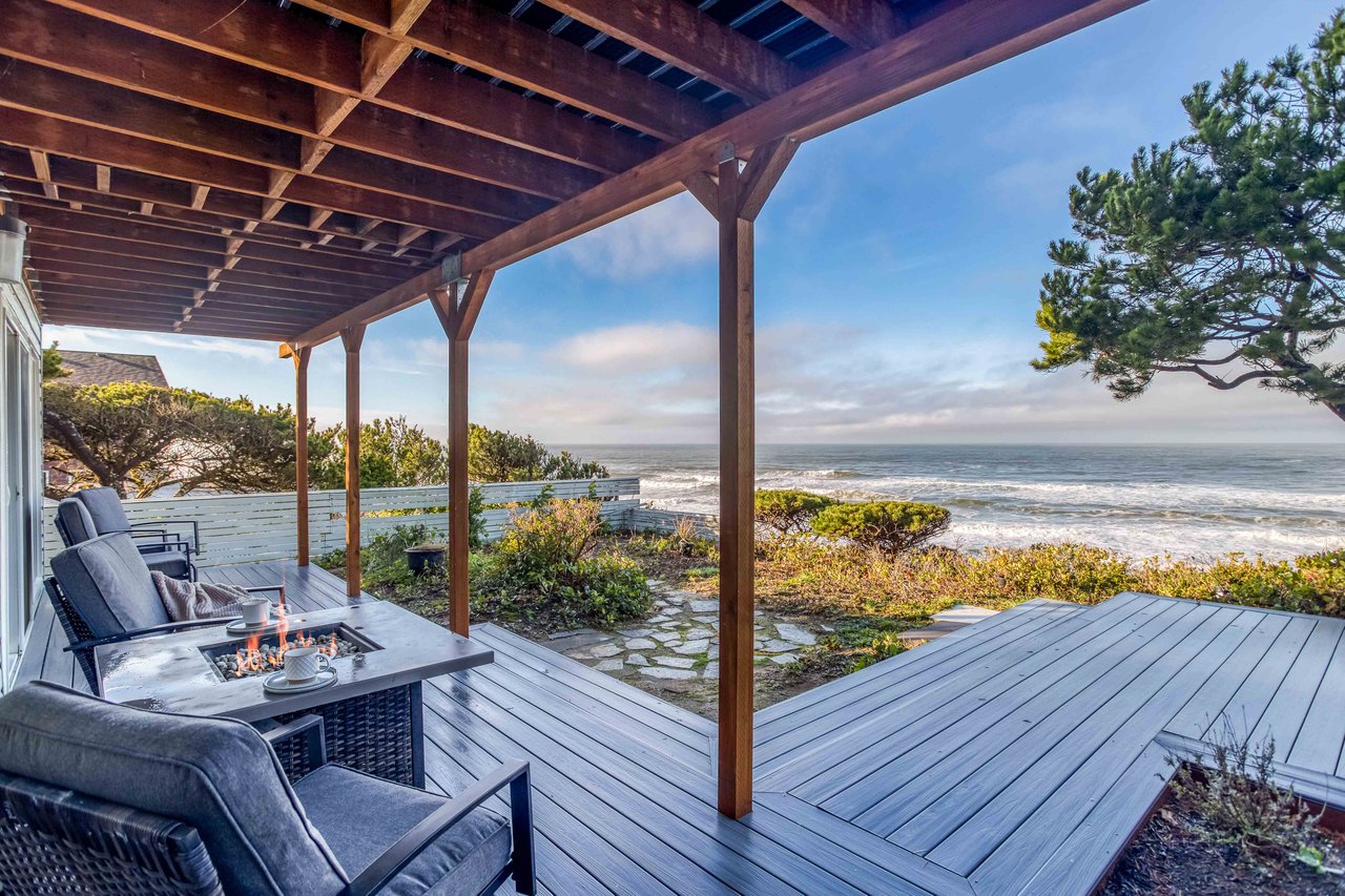 Climb the stairs to breathtaking, panoramic views of the Pacific in The Holiday House, a thoughtfully updated, beautifully decorated, fun-loving home with everything you need for a terrific stay in Lincoln City. The upper-level great room has ample seating on blue leather sofas and a large Smart TV and cabinet Murphy bed, but your guests will likely be found in the adjoining game room, cueing up at the ocean-view pool table for some friendly competition. They’ll also hang out around the fully equipped coffee bar, which spans an entire dining area wall and leads you into the newly updated kitchen. This desirable kitchen has new stainless-steel appliances and the home is equipped with an outdoor propane BBQ! You will have everything you need to prepare a snack or a feast. Take a drink out on the deck for stunning views of the endless ocean where you’ll see incredible sunsets, whales, seabirds, and churning surf. At the right time of year, you’ll be in a position on the deck to watch the famous offshore Nelscott Reef surf competition.