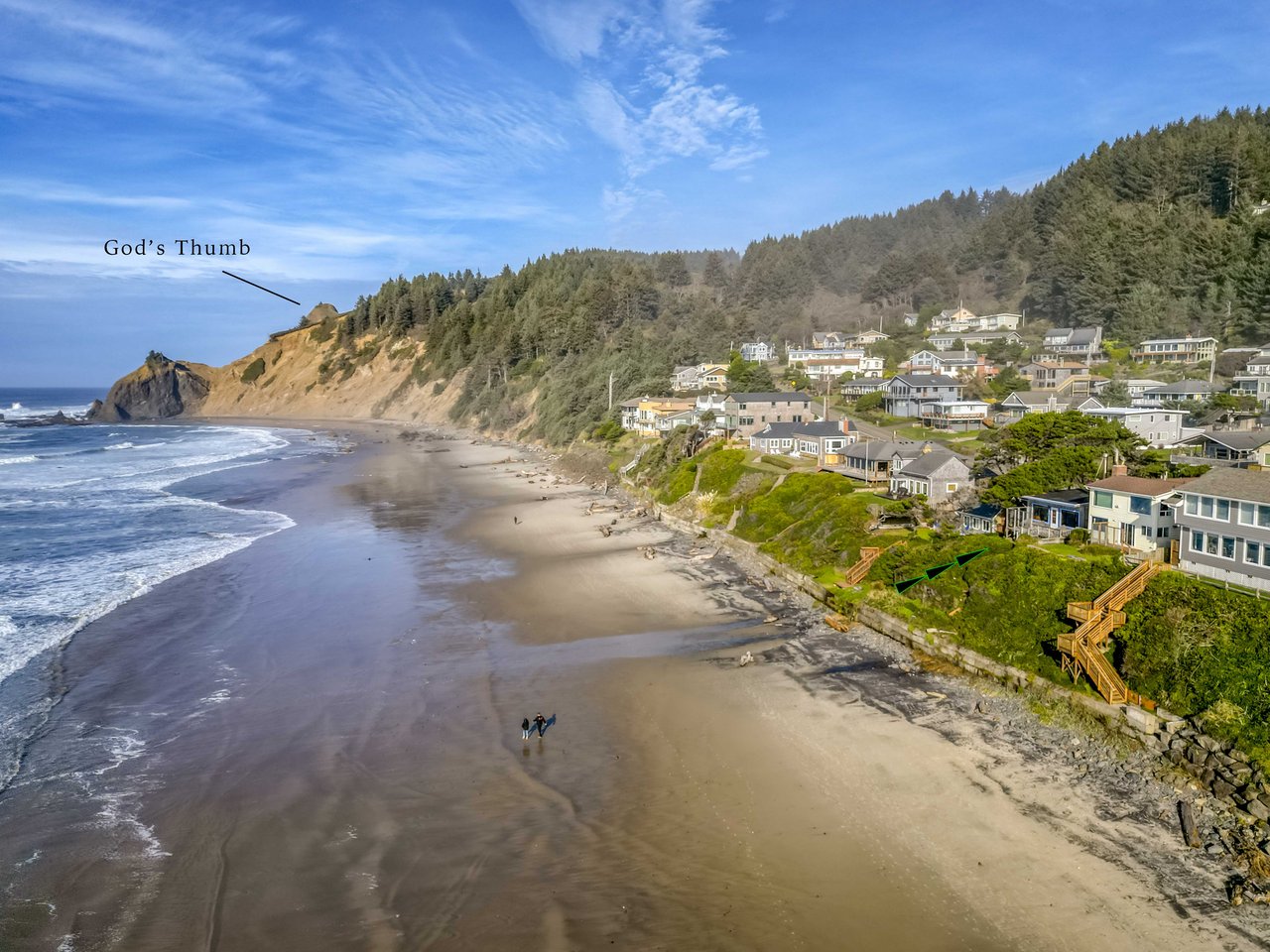 Salal Bluff also embraces its rustic nature as a classic Oregon beachfront cottage, with its warm wood-clad walls, box beam ceilings, and solid wood plank doors. Cooks will enjoy a well-equipped kitchen with updated appliances, and vintage knotty plank cabinetry. Colossal windows to the North and West, allow spectacular living and dining room views of the surf, Roads End Point, and Rock Island. Follow the private beach access trail directly down to the beach!