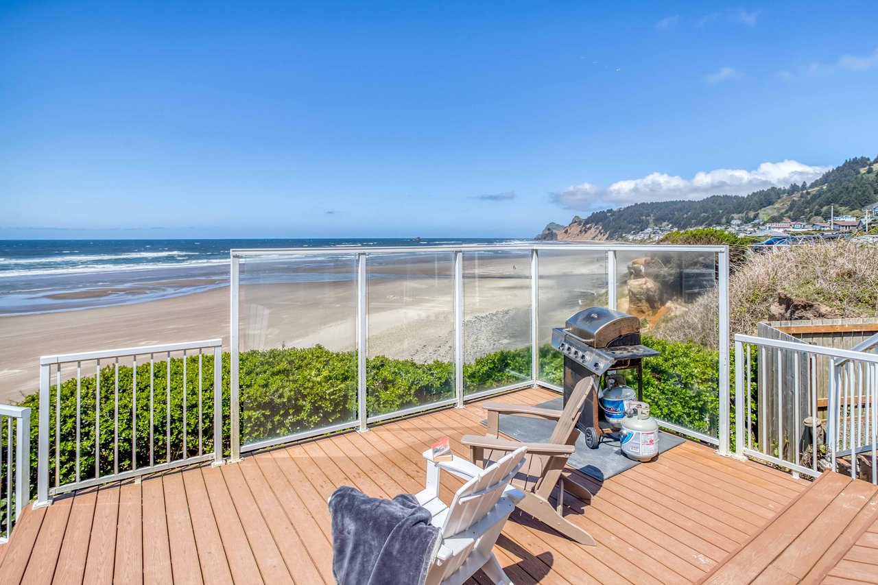 Step into the stunning Sunset Ridge, an oceanfront gem in Lincoln City, and be blown away by the beauty of the upgraded home and the endless ocean views. Just steps away from the Roads End State Recreation Site, this home provides endless opportunities for creating priceless memories. The upstairs has a luxurious primary bedroom with a king bed, TV, gorgeous bathroom with a jetted tub, and private deck with breathtaking beach views. Two more bedrooms, both with queen beds, are on the upper level to provide additional space for family and friends. The downstairs features another primary bedroom with a king bed and full bathroom, along with a kids' room with two twin beds.