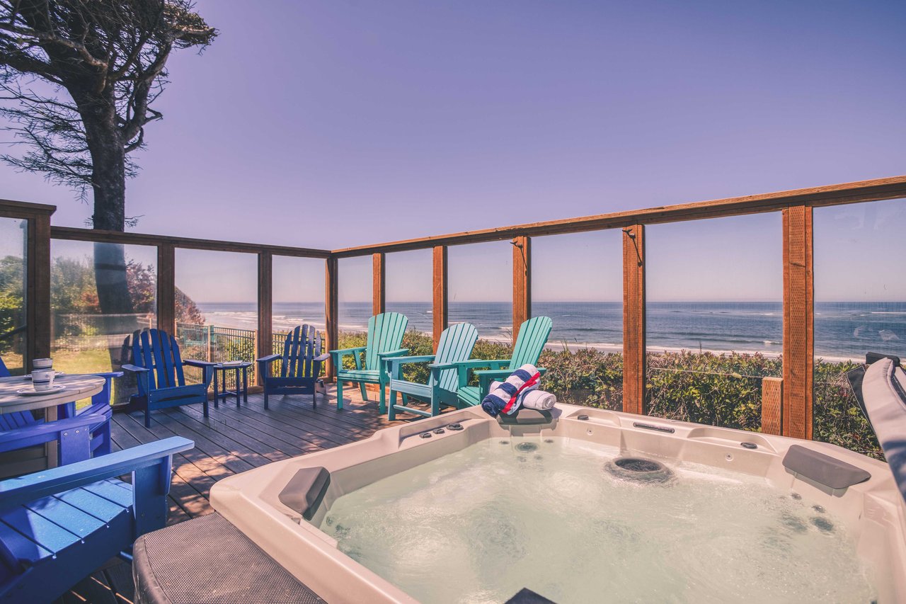 Prepare for a cozy and wonderful stay in Historic Dowd House, a historic oceanfront home with two living areas steeped in classic Oregon Coast cottage detail. Perched on a high cliff above the southern side of Alsea Bay, you’ll have sea views from the home and panoramic outdoor views of the south and north sand spits, Alsea Bay and the Pacific. You’ll love the eclectic, old-world details of the cottage, from beamed wood ceilings, antique furnishings and an amazing rock-and-shell-embedded wood-burning fireplace hearth with clever sailing ships on the mantle. Fully equipped kitchen, along with a second living room, making this a great home to share with another family. There’s one ground-level bedroom with a nearby bath, and two upstairs sleeping areas, each with its own staircase. One side has a bath and two bedrooms, a queen and an ocean-view king with a charming twin bed with a window to the sea. The other side is a wood-lined queen suite with a private ocean-view deck. Located down a lane in a quiet residential area, Historic Dowd House is just up the hill from Waldport, walking distance to the Hilltop Cafe-Bistro, and an easy drive to all the fun activities in Newport or Florence, with all the stellar scenery in between.
