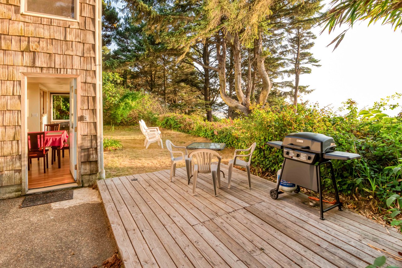 A beach getaway isn't just for nice weather either: on stormy nights you can be nice and toasty inside, sipping hot cocoa and listening to the rain fall outside. When there is nice weather, a door just off the living room leads to a patio with stunning ocean views, a gas grill, and fire pit.