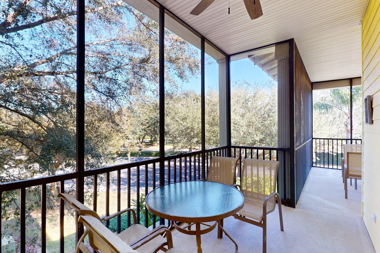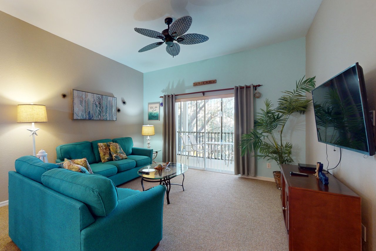 Blending comfort and value, this two-bedroom condo provides 1,116 square feet of space and enticing extras such as a private laundry room, a screened balcony, and vaulted ceilings. This home includes a queen-size bed in the main bedroom, two twin beds in the guest bedroom, and two full bathrooms. Perfect for vacationers with children, this villa also includes a crib and a high chair. The large, fully equipped kitchen has all the major appliances, crockery, cookware, utensils, and glassware, so you can stay in and have family meals in the dining area. Two large televisions with included cable channels mean different groups can stretch out in the spacious living area and in the main bedroom to enjoy different programming at the same time.