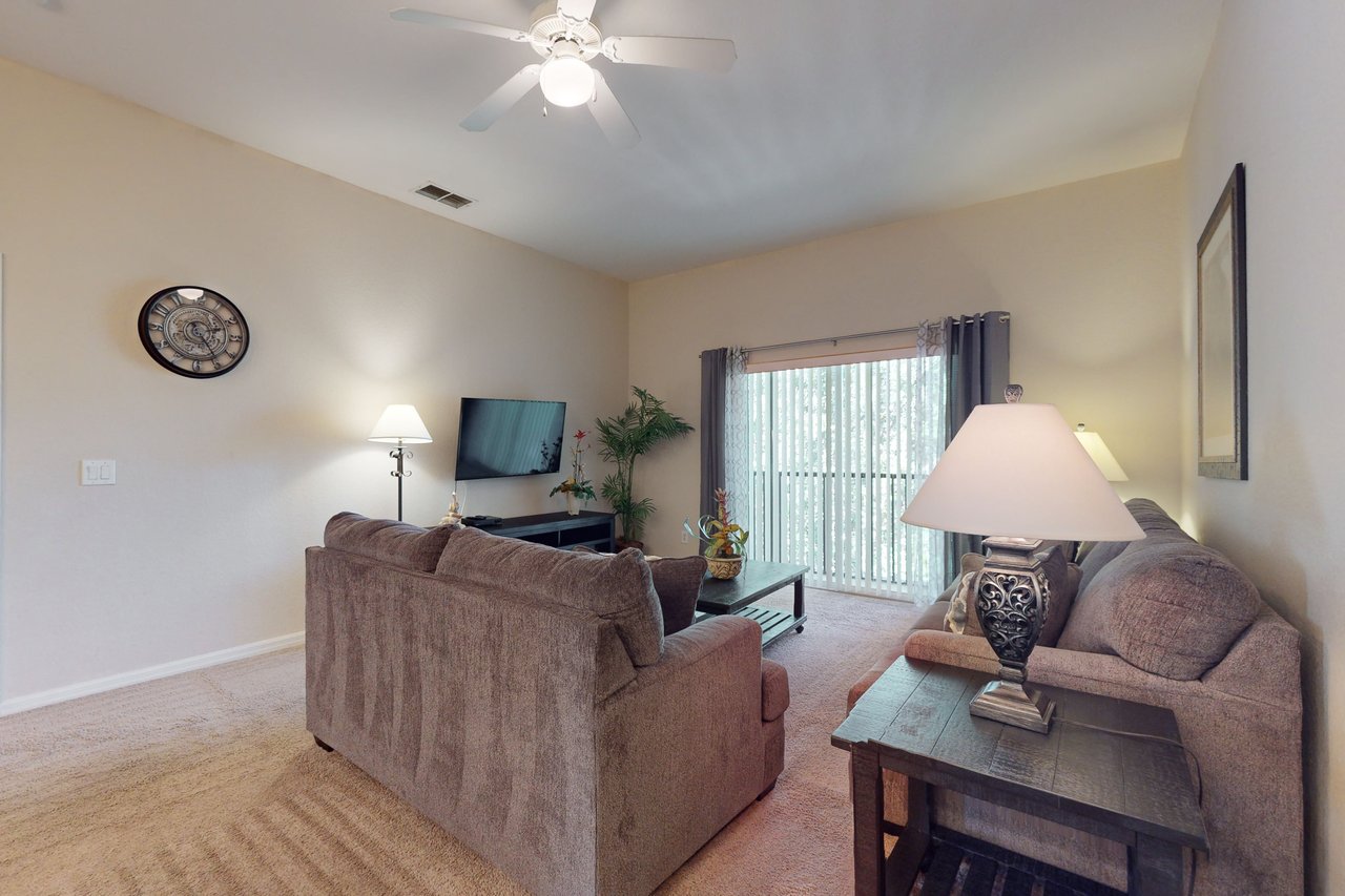 The most spacious of all our properties, the Gran Bahama villas offer more than 1,700 square feet of living area, perfect for larger families looking for accommodation near the Magic Kingdom. This villa boasts a king-sized bed in the primary bedroom, along with a queen-sized bed in the first guest bedroom and two twin beds in the second guest bedroom. Each unit includes a highchair and portable play yard, for families traveling with infants. The Gran Bahama villas also feature two full bathrooms - with the primary bath featuring dual sinks and a separate tub and shower. With a fully equipped kitchen and in-unit laundry room, the Gran Bahama Villa has all the conveniences of home combined with all the amenities of a resort. So whether you start your day off with a coffee on the screened-in balcony of your villa, a swim in one of Bahama Bay's four pools, or a walk around the beautifully maintained grounds, Bahama Bay is an ideal location for your next Orlando vacation.