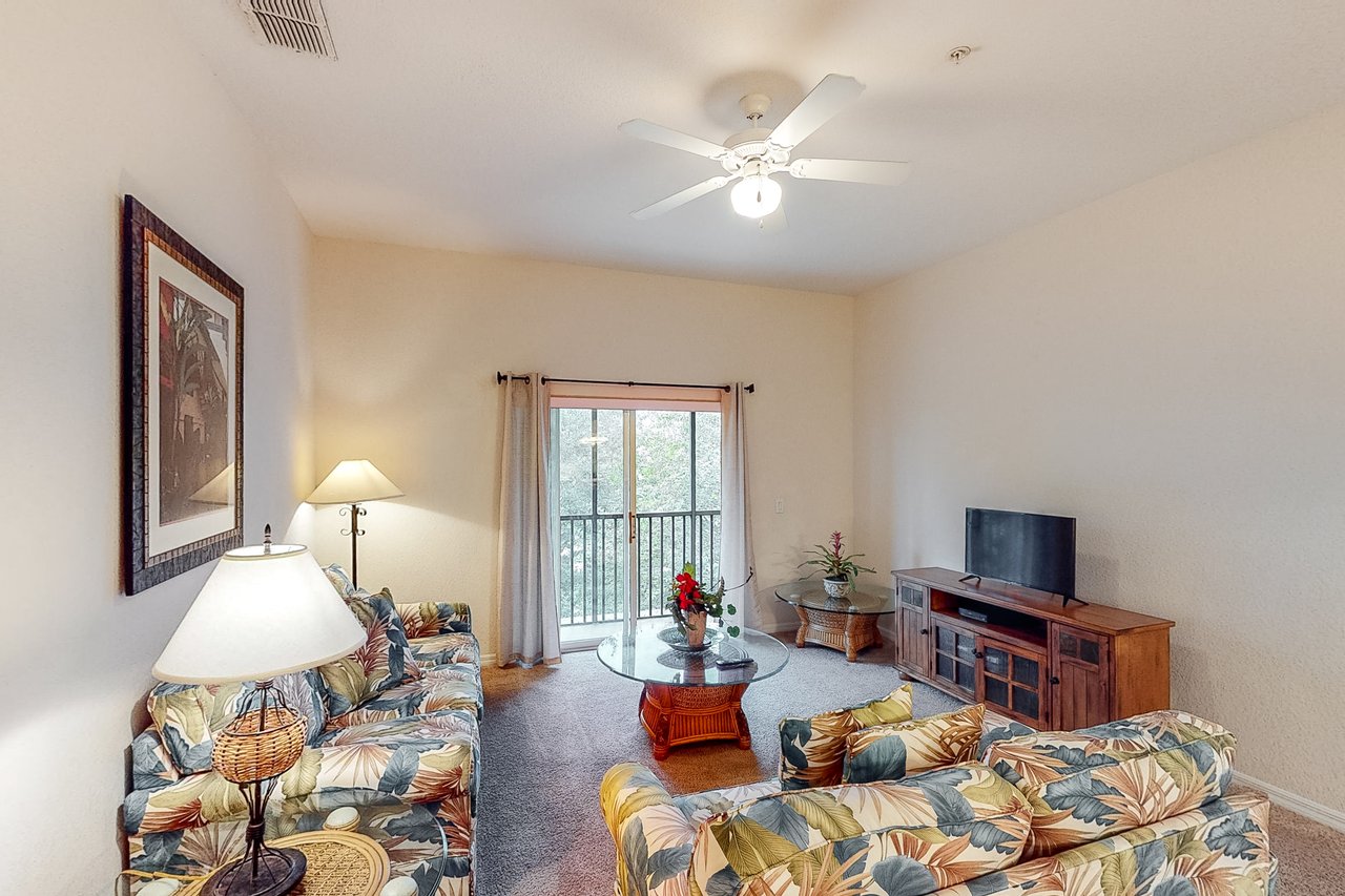 The most spacious of all our properties, the Gran Bahama villas offer more than 1,700 square feet of living area, perfect for larger families looking for accommodation near the Magic Kingdom. This villa boasts a king-sized bed in the master bedroom, along with a queen-sized bed in the first guest bedroom and two twin beds in the second guest bedroom. There is also a queen-sized sofabed in the living area. Each unit includes a highchair and portable play yard, for families travelling with infants. The Gran Bahama villas also feature two full bathrooms - with the master bath featuring dual sinks and a separate tub and shower. With a fully equipped kitchen, and in-unit laundry room, the Gran Bahama Villa has all the conveniences of home combined with all the amenities of a resort. So whether you start your day off with a coffee on the screened-in balcony of your villa, a swim in one of Bahama Bay's four pools, or a walk around the beautifully maintained grounds...Bahama Bay is an ideal location for your next Orlando vacation. What's nearby: The Bahama Bay Resort & Spa boasts amenities like shared pools, hot tubs, fitness center, and a sauna. Located on the shores of Old Lake Davenport, you can enjoy the sand beach, view wildlife from the pier, or relax in a hammock. The resort is also conveniently located near Polo Park East Golf Course. Located only 10 miles from Walt Disney World, there are plenty of local dining and shopping options nearby. Disney Springs offers over 100 shops and 60 restaurants along with daily and nightly entertainment. Gatorland has a free-flight aviary, petting zoo, animal shows, zip line, and a new Stompin' Gator Off-Road Adventure. For additional entertainment, Sea World is just 16 miles away, Universal Studios is 22 miles and for the younger guests, Legoland Florida is 23 miles away from the resort. The Tradewinds Restaurant and Bar, located within the resort, is located poolside on the shore of Lake Davenport. With both indoor and outdoor seating, as well as a bar with lake views, guests can enjoy ice cold drinks, signature burgers and fries, and more! The Market Place, located in the main Clubhouse, offers a wide selection of items from sundries and necessities to souvenirs, apparel, gifts, drinks, snacks, ice cream, and accessories. Things to know: Free WiFi Full Kitchen Please note: All shared amenities are open and operating under limited capacity and new operating hours. Specific information will be provided after booking. Outdoor parking is available at no charge. Motorcycles are permitted but may not remain on a trailer. Trailers of any kind, RVs, and jet skis are not allowed. Commercial or logo-marked vehicles are also prohibited unless they are actively providing service or making a delivery.