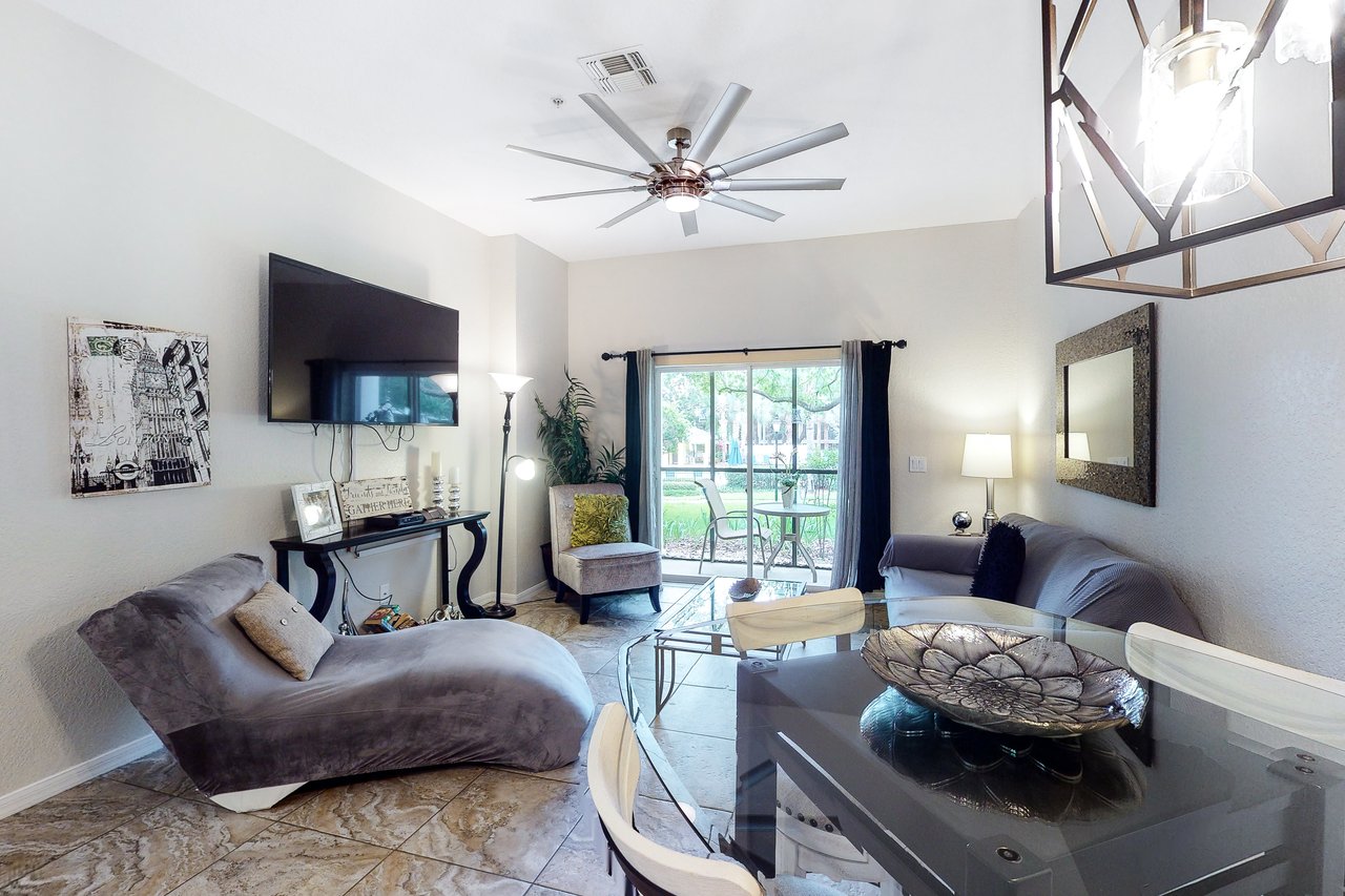 Boasting more than 1,200 square feet of space, the 3-bedroom Abacos villas at Bahama Bay Resort & Spa are ideal for family vacations or group getaways. Comfortable queen-sized beds are standard in the master bedroom and first guest bedroom, while the second guest bedroom features two twin beds. Additional sleeping space is available via a sleeper-sofa that opens up into a queen-sized bed in the living room. The Abacos villas feature two full bathrooms. Enjoy meals in the fully-equipped kitchen which includes all major appliances such as a refrigerator, oven, stove and microwave, and also includes cookware, utensils, and glassware. With plenty of room to spread out, guests will love the spacious living room-dining room area and can take in the scenery from a screened balcony with tables and chairs. An in-unit laundry room means guests can wash clothes while watching cable TV in the living room or master bedroom, or while keeping an eye on the little ones in the crib and highchair included in each unit. What's nearby: The Bahama Bay Resort & Spa boasts amenities like shared pools, hot tubs, fitness center, and a sauna. Located on the shores of Old Lake Davenport, you can enjoy the sand beach, view wildlife from the pier, or relax in a hammock. The resort is also conveniently located near Polo Park East Golf Course. Located only 10 miles from Walt Disney World, there are plenty of local dining and shopping options nearby. Disney Springs offers over 100 shops and 60 restaurants along with daily and nightly entertainment. Gatorland has a free-flight aviary, petting zoo, animal shows, zip line, and a new Stompin' Gator Off-Road Adventure. For additional entertainment, Sea World is just 16 miles away, Universal Studios is 22 miles and for the younger guests, Legoland Florida is 23 miles away from the resort. The Tradewinds Restaurant and Bar, located within the resort, is located poolside on the shore of Lake Davenport. With both indoor and outdoor seating, as well as a bar with lake views, guests can enjoy ice cold drinks, signature burgers and fries, and more! The Market Place, located in the main Clubhouse, offers a wide selection of items from sundries and necessities to souvenirs, apparel, gifts, drinks, snacks, ice cream, and accessories. Things to know: Free WiFi Full Kitchen Please note: All shared amenities are open and operating under limited capacity and new operating hours. Specific information will be provided after booking. Outdoor parking is available at no charge. Motorcycles are permitted but may not remain on a trailer. Trailers of any kind, RVs, and jet skis are not allowed. Commercial or logo-marked vehicles are also prohibited unless they are actively providing service or making a delivery.