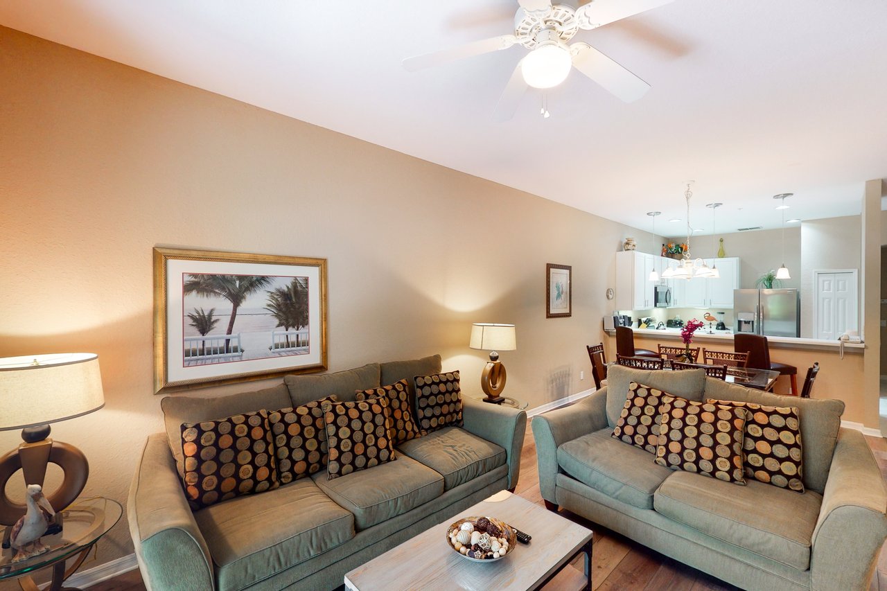 Blending comfort and value, the 2-bedroom San Salvador provides 1,116 square feet of space and enticing extras such as an in-unit laundry room, a private screened balcony and vaulted ceilings. The San Salvador includes a king-sized bed in the master bedroom, two twin beds in the guest bedroom, and a sofa in the living room that opens into a queen-sized bed. Perfect for vacationers who have children, this villa includes a crib and a highchair, and has two full bathrooms. The San Salvador's large and fully-equipped kitchen has all the major appliances and also includes crockery, cookware, utensils and glassware so you can stay in and have family meals in the dining area. Two large televisions with included cable channels mean different groups can stretch out in the spacious living area and in the master bedroom to enjoy different programming at the same time.