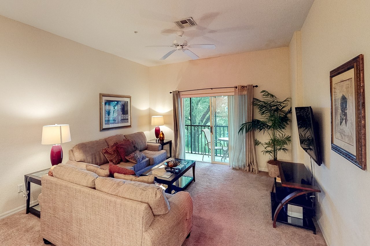 Boasting more than 1,200 square feet of space, the 3-bedroom Abacos villas at Bahama Bay Resort & Spa are ideal for family vacations or group getaways. Comfortable queen-sized beds are standard in the master bedroom and first guest bedroom, while the second guest bedroom features two twin beds. Additional sleeping space is available via a sleeper-sofa that opens up into a queen-sized bed in the living room. The Abacos villas feature two full bathrooms. Enjoy meals in the fully-equipped kitchen which includes all major appliances such as a refrigerator, oven, stove and microwave, and also includes cookware, utensils, and glassware. With plenty of room to spread out, guests will love the spacious living room-dining room area and can take in the scenery from a screened balcony with tables and chairs. An in-unit laundry room means guests can wash clothes while watching cable TV in the living room or master bedroom, or while keeping an eye on the little ones in the crib and highchair included in each unit. What's nearby: The Bahama Bay Resort & Spa boasts amenities like shared pools, hot tubs, fitness center, and a sauna. Located on the shores of Old Lake Davenport, you can enjoy the sand beach, view wildlife from the pier, or relax in a hammock. The resort is also conveniently located near Polo Park East Golf Course. Located only 10 miles from Walt Disney World, there are plenty of local dining and shopping options nearby. Disney Springs offers over 100 shops and 60 restaurants along with daily and nightly entertainment. Gatorland has a free-flight aviary, petting zoo, animal shows, zip line, and a new Stompin' Gator Off-Road Adventure. For additional entertainment, Sea World is just 16 miles away, Universal Studios is 22 miles and for the younger guests, Legoland Florida is 23 miles away from the resort. The Tradewinds Restaurant and Bar, located within the resort, is located poolside on the shore of Lake Davenport. With both indoor and outdoor seating, as well as a bar with lake views, guests can enjoy ice cold drinks, signature burgers and fries, and more! The Market Place, located in the main Clubhouse, offers a wide selection of items from sundries and necessities to souvenirs, apparel, gifts, drinks, snacks, ice cream, and accessories. Things to know: Free WiFi Full Kitchen Please note: All shared amenities are open and operating under limited capacity and new operating hours. Specific information will be provided after booking. Outdoor parking is available at no charge. Motorcycles are permitted but may not remain on a trailer. Trailers of any kind, RVs, and jet skis are not allowed. Commercial or logo-marked vehicles are also prohibited unless they are actively providing service or making a delivery.