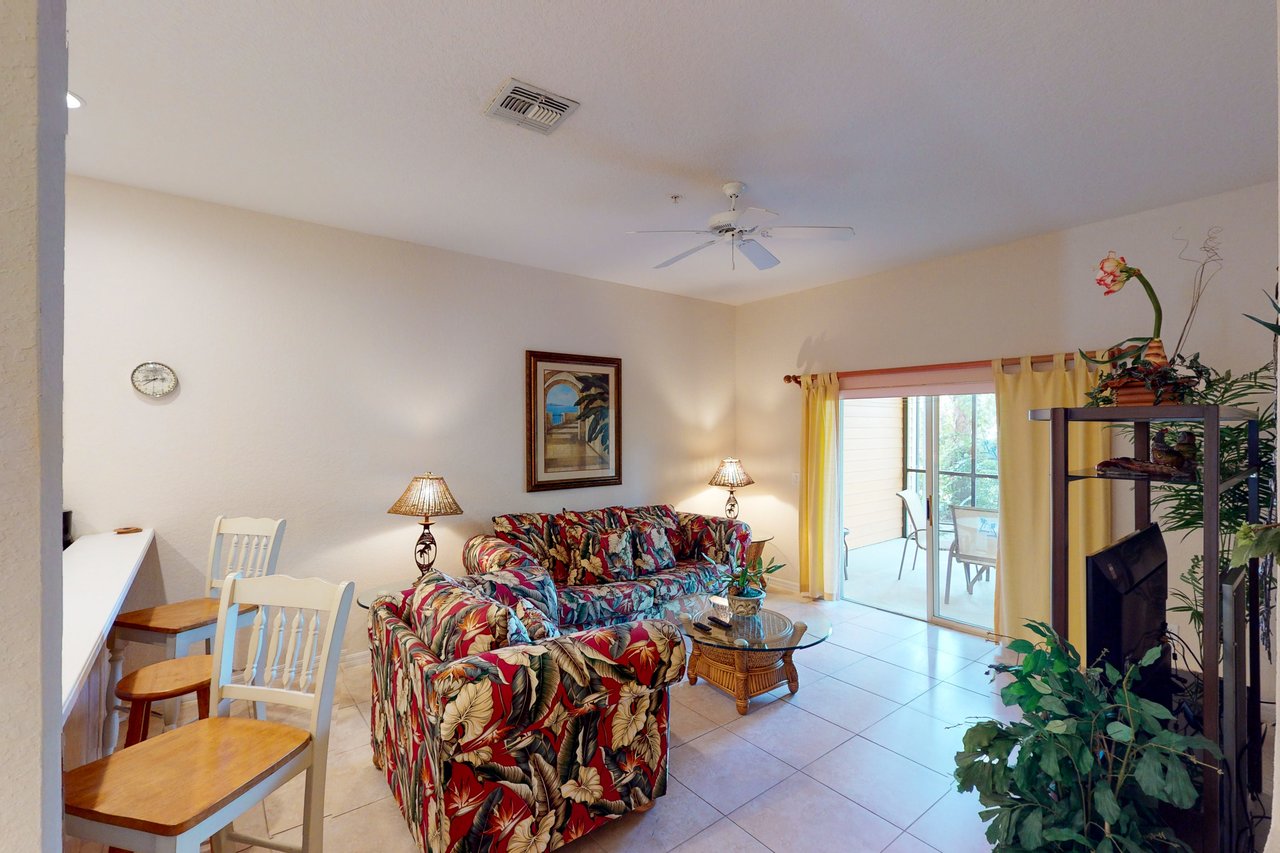 The Andros is our plus-sized 2-bedroom villa boasting nearly 1,400 square feet of livable space and amazing architectural details like vaulted ceilings throughout. The Andros includes a king-sized bed in the master bedroom, two twin beds in the guest bedroom and a sofa in the living room that opens into a queen-sized bed. Available with laminate flooring or full carpet throughout, our Andros villa is perfect for vacationers who have children. The Andros has a crib, a highchair, and two full bathrooms - the master bath has dual sinks, separate showers, and a tub. It also features a large and fully-equipped kitchen which has all major appliances and includes crockery, cookware, utensils, and glassware so you can stay in and have family meals in the dining area. Enjoy coffee, drinks and the views from one of your two screened balconies. Or, stretch out in the spacious living area and enjoy cable TV while washing clothes in the in-unit laundry room. What's nearby: The Bahama Bay Resort & Spa boasts amenities like shared pools, hot tubs, fitness center, and a sauna. Located on the shores of Old Lake Davenport, you can enjoy the sand beach, view wildlife from the pier, or relax in a hammock. The resort is also conveniently located near Polo Park East Golf Course. Located only 10 miles from Walt Disney World, there are plenty of local dining and shopping options nearby. Disney Springs offers over 100 shops and 60 restaurants along with daily and nightly entertainment. Gatorland has a free-flight aviary, petting zoo, animal shows, zip line, and a new Stompin' Gator Off-Road Adventure. For additional entertainment, Sea World is just 16 miles away, Universal Studios is 22 miles and for the younger guests, Legoland Florida is 23 miles away from the resort. The Tradewinds Restaurant and Bar, located within the resort, is located poolside on the shore of Lake Davenport. With both indoor and outdoor seating, as well as a bar with lake views, guests can enjoy ice cold drinks, signature burgers and fries, and more! The Market Place, located in the main Clubhouse, offers a wide selection of items from sundries and necessities to souvenirs, apparel, gifts, drinks, snacks, ice cream, and accessories. Things to know: Free WiFi Full Kitchen Please note: All shared amenities are open and operating under limited capacity and new operating hours. Specific information will be provided after booking. Outdoor parking is available at no charge. Motorcycles are permitted but may not remain on a trailer. Trailers of any kind, RVs, and jet skis are not allowed. Commercial or logo-marked vehicles are also prohibited unless they are actively providing service or making a delivery.