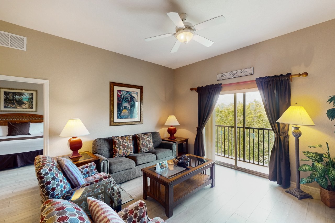 The most spacious of all our properties, the Gran Bahama villas offer more than 1,700 square feet of living area, perfect for larger families looking for accommodation near the Magic Kingdom. This villa boasts a king-sized bed in the master bedroom, along with a queen-sized bed in the first guest bedroom and two twin beds in the second guest bedroom. There is also a queen-sized sofabed in the living area. Each unit includes a highchair and portable play yard, for families travelling with infants. The Gran Bahama villas also feature two full bathrooms - with the master bath featuring dual sinks and a separate tub and shower. With a fully equipped kitchen, and in-unit laundry room, the Gran Bahama Villa has all the conveniences of home combined with all the amenities of a resort. So whether you start your day off with a coffee on the screened-in balcony of your villa, a swim in one of Bahama Bay's four pools, or a walk around the beautifully maintained grounds...Bahama Bay is an ideal location for your next Orlando vacation. What's nearby: The Bahama Bay Resort & Spa boasts amenities like shared pools, hot tubs, fitness center, and a sauna. Located on the shores of Old Lake Davenport, you can enjoy the sand beach, view wildlife from the pier, or relax in a hammock. The resort is also conveniently located near Polo Park East Golf Course. Located only 10 miles from Walt Disney World, there are plenty of local dining and shopping options nearby. Disney Springs offers over 100 shops and 60 restaurants along with daily and nightly entertainment. Gatorland has a free-flight aviary, petting zoo, animal shows, zip line, and a new Stompin' Gator Off-Road Adventure. For additional entertainment, Sea World is just 16 miles away, Universal Studios is 22 miles and for the younger guests, Legoland Florida is 23 miles away from the resort. The Tradewinds Restaurant and Bar, located within the resort, is located poolside on the shore of Lake Davenport. With both indoor and outdoor seating, as well as a bar with lake views, guests can enjoy ice cold drinks, signature burgers and fries, and more! The Market Place, located in the main Clubhouse, offers a wide selection of items from sundries and necessities to souvenirs, apparel, gifts, drinks, snacks, ice cream, and accessories. Things to know: Free WiFi Full Kitchen Please note: All shared amenities are open and operating under limited capacity and new operating hours. Specific information will be provided after booking. Outdoor parking is available at no charge. Motorcycles are permitted but may not remain on a trailer. Trailers of any kind, RVs, and jet skis are not allowed. Commercial or logo-marked vehicles are also prohibited unless they are actively providing service or making a delivery.