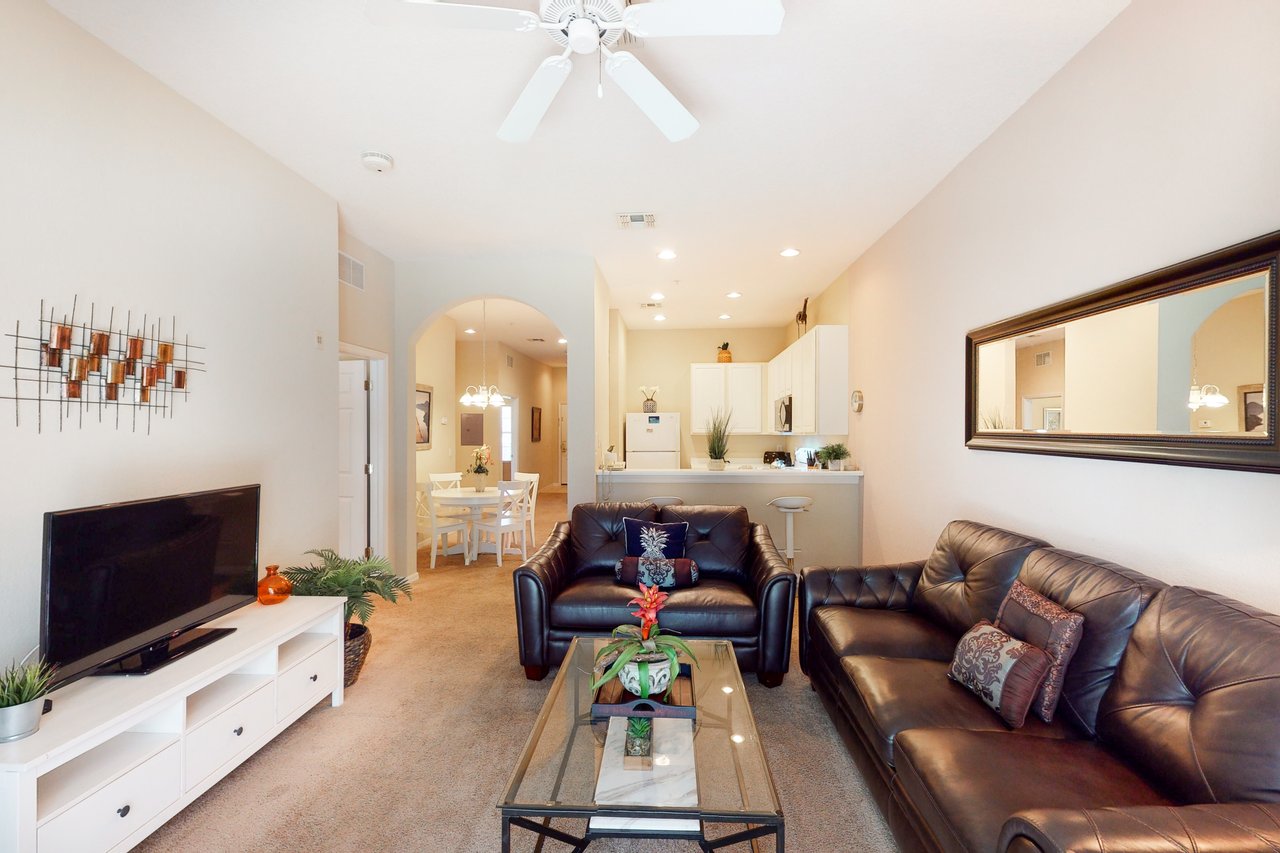 Boasting more than 1,200 square feet of space, the 3-bedroom Abacos villas at Bahama Bay Resort & Spa are ideal for family vacations or group getaways. Comfortable queen-sized beds are standard in the master bedroom and first guest bedroom, while the second guest bedroom features two twin beds. Additional sleeping space is available via a sleeper-sofa that opens up into a queen-sized bed in the living room. The Abacos villas feature two full bathrooms. Enjoy meals in the fully-equipped kitchen which includes all major appliances such as a refrigerator, oven, stove and microwave, and also includes cookware, utensils, and glassware. With plenty of room to spread out, guests will love the spacious living room-dining room area and can take in the scenery from a screened balcony with tables and chairs. An in-unit laundry room means guests can wash clothes while watching cable TV in the living room or master bedroom, or while keeping an eye on the little ones in the crib and highchair included in each unit. What's nearby: The Bahama Bay Resort & Spa boasts amenities like shared pools, hot tubs, fitness center, and a sauna. Located on the shores of Old Lake Davenport, you can enjoy the sand beach, view wildlife from the pier, or relax in a hammock. The resort is also conveniently located near Polo Park East Golf Course. Located only 10 miles from Walt Disney World, there are plenty of local dining and shopping options nearby. Disney Springs offers over 100 shops and 60 restaurants along with daily and nightly entertainment. Gatorland has a free-flight aviary, petting zoo, animal shows, zip line, and a new Stompin' Gator Off-Road Adventure. For additional entertainment, Sea World is just 16 miles away, Universal Studios is 22 miles and for the younger guests, Legoland Florida is 23 miles away from the resort. The Tradewinds Restaurant and Bar, located within the resort, is located poolside on the shore of Lake Davenport. With both indoor and outdoor seating, as well as a bar with lake views, guests can enjoy ice cold drinks, signature burgers and fries, and more! The Market Place, located in the main Clubhouse, offers a wide selection of items from sundries and necessities to souvenirs, apparel, gifts, drinks, snacks, ice cream, and accessories. Things to know: Free WiFi Full Kitchen Please note: All shared amenities are open and operating under limited capacity and new operating hours. Specific information will be provided after booking. Outdoor parking is available at no charge. Motorcycles are permitted but may not remain on a trailer. Trailers of any kind, RVs, and jet skis are not allowed. Commercial or logo-marked vehicles are also prohibited unless they are actively providing service or making a delivery.