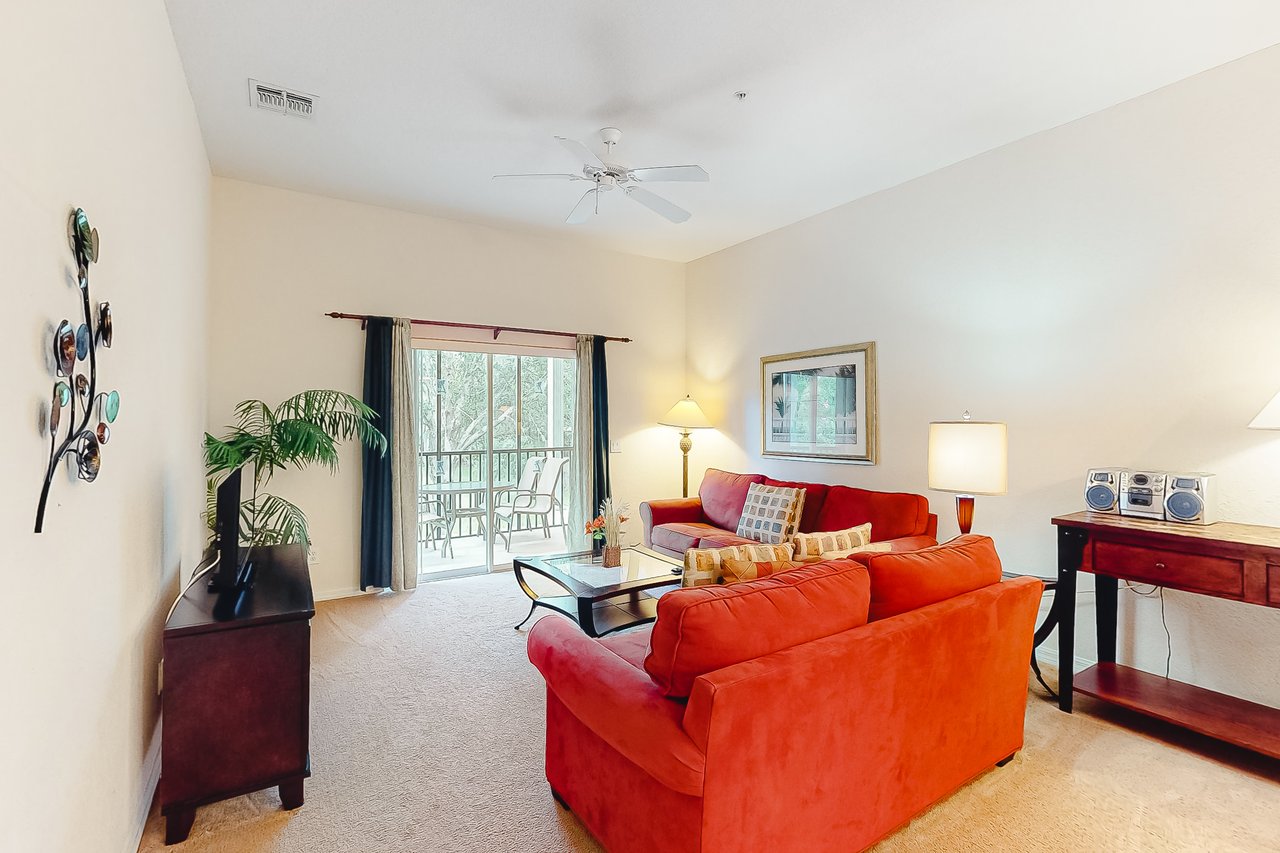 Blending comfort and value, the 2-bedroom San Salvador provides 1,116 square feet of space and enticing extras such as an in-unit laundry room, a private screened balcony and vaulted ceilings. The San Salvador includes a queen-sized bed in the master bedroom, two twin beds in the guest bedroom, and a sofa in the living room that opens into a queen-sized bed. Perfect for vacationers who have children, this villa includes a crib and a highchair, and has two full bathrooms. The San Salvador's large and fully-equipped kitchen has all the major appliances and also includes crockery, cookware, utensils and glassware so you can stay in and have family meals in the dining area. Two large televisions with included cable channels mean different groups can stretch out in the spacious living area and in the master bedroom to enjoy different programming at the same time. What's nearby: The Bahama Bay Resort & Spa boasts amenities like shared pools, hot tubs, fitness center, and a sauna. Located on the shores of Old Lake Davenport, you can enjoy the sand beach, view wildlife from the pier, or relax in a hammock. The resort is also conveniently located near Polo Park East Golf Course. Located only 10 miles from Walt Disney World, there are plenty of local dining and shopping options nearby. Disney Springs offers over 100 shops and 60 restaurants along with daily and nightly entertainment. Gatorland has a free-flight aviary, petting zoo, animal shows, zip line, and a new Stompin' Gator Off-Road Adventure. For additional entertainment, Sea World is just 16 miles away, Universal Studios is 22 miles and for the younger guests, Legoland Florida is 23 miles away from the resort. The Tradewinds Restaurant and Bar, located within the resort, is located poolside on the shore of Lake Davenport. With both indoor and outdoor seating, as well as a bar with lake views, guests can enjoy ice cold drinks, signature burgers and fries, and more! The Market Place, located in the main Clubhouse, offers a wide selection of items from sundries and necessities to souvenirs, apparel, gifts, drinks, snacks, ice cream, and accessories. Things to know: Free WiFi Full Kitchen Please note: All shared amenities are open and operating under limited capacity and new operating hours. Specific information will be provided after booking. Outdoor parking is available at no charge. Motorcycles are permitted but may not remain on a trailer. Trailers of any kind, RVs, and jet skis are not allowed. Commercial or logo-marked vehicles are also prohibited unless they are actively providing service or making a delivery.
