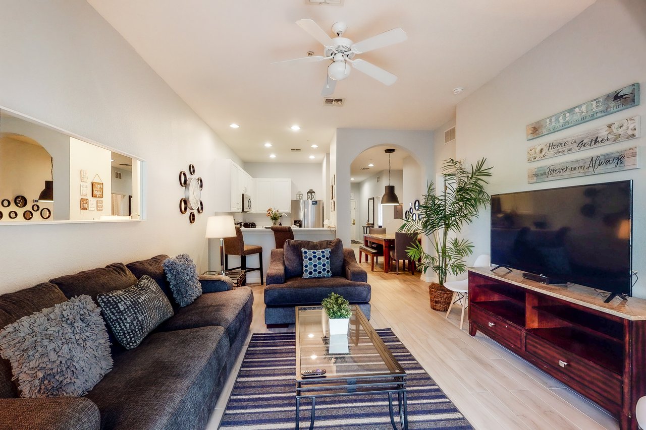 Boasting more than 1,200 square feet of space, the 3-bedroom Abacos villas at Bahama Bay Resort & Spa are ideal for family vacations or group getaways. Comfortable queen-sized beds are standard in the master bedroom and first guest bedroom, while the second guest bedroom features two twin beds. The Abacos villas feature two full bathrooms. Enjoy meals in the fully-equipped kitchen which includes all major appliances such as a refrigerator, oven, stove and microwave, and also includes cookware, utensils, and glassware. With plenty of room to spread out, guests will love the spacious living room-dining room area and can take in the scenery from a screened balcony with tables and chairs. An in-unit laundry room means guests can wash clothes while watching cable TV in the living room or master bedroom, or while keeping an eye on the little ones in the crib and highchair included in each unit. What's nearby: The Bahama Bay Resort & Spa boasts amenities like shared pools, hot tubs, fitness center, and a sauna. Located on the shores of Old Lake Davenport, you can enjoy the sand beach, view wildlife from the pier, or relax in a hammock. The resort is also conveniently located near Polo Park East Golf Course. Located only 10 miles from Walt Disney World, there are plenty of local dining and shopping options nearby. Disney Springs offers over 100 shops and 60 restaurants along with daily and nightly entertainment. Gatorland has a free-flight aviary, petting zoo, animal shows, zip line, and a new Stompin' Gator Off-Road Adventure. For additional entertainment, Sea World is just 16 miles away, Universal Studios is 22 miles and for the younger guests, Legoland Florida is 23 miles away from the resort. The Tradewinds Restaurant and Bar, located within the resort, is located poolside on the shore of Lake Davenport. With both indoor and outdoor seating, as well as a bar with lake views, guests can enjoy ice cold drinks, signature burgers and fries, and more! The Market Place, located in the main Clubhouse, offers a wide selection of items from sundries and necessities to souvenirs, apparel, gifts, drinks, snacks, ice cream, and accessories. Things to know: Free WiFi Full Kitchen Please note: All shared amenities are open and operating under limited capacity and new operating hours. Specific information will be provided after booking. Outdoor parking is available at no charge. Motorcycles are permitted but may not remain on a trailer. Trailers of any kind, RVs, and jet skis are not allowed. Commercial or logo-marked vehicles are also prohibited unless they are actively providing service or making a delivery.