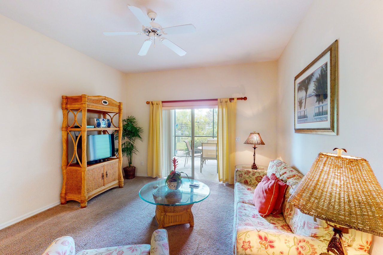 The Andros is our plus-sized 2-bedroom villa boasting nearly 1,400 square feet of livable space and amazing architectural details like vaulted ceilings throughout. The Andros includes a king-sized bed in the master bedroom, two twin beds in the guest bedroom and a sofa in the living room that opens into a queen-sized bed. Available with laminate flooring or full carpet throughout, our Andros villa is perfect for vacationers who have children. The Andros has a crib, a highchair, and two full bathrooms - the master bath has dual sinks, separate showers, and a tub. It also features a large and fully-equipped kitchen which has all major appliances and includes crockery, cookware, utensils, and glassware so you can stay in and have family meals in the dining area. Enjoy coffee, drinks and the views from one of your two screened balconies. Or, stretch out in the spacious living area and enjoy cable TV while washing clothes in the in-unit laundry room. What's nearby: The Bahama Bay Resort & Spa boasts amenities like shared pools, hot tubs, fitness center, and a sauna. Located on the shores of Old Lake Davenport, you can enjoy the sand beach, view wildlife from the pier, or relax in a hammock. The resort is also conveniently located near Polo Park East Golf Course. Located only 10 miles from Walt Disney World, there are plenty of local dining and shopping options nearby. Disney Springs offers over 100 shops and 60 restaurants along with daily and nightly entertainment. Gatorland has a free-flight aviary, petting zoo, animal shows, zip line, and a new Stompin' Gator Off-Road Adventure. For additional entertainment, Sea World is just 16 miles away, Universal Studios is 22 miles and for the younger guests, Legoland Florida is 23 miles away from the resort. The Tradewinds Restaurant and Bar, located within the resort, is located poolside on the shore of Lake Davenport. With both indoor and outdoor seating, as well as a bar with lake views, guests can enjoy ice cold drinks, signature burgers and fries, and more! The Market Place, located in the main Clubhouse, offers a wide selection of items from sundries and necessities to souvenirs, apparel, gifts, drinks, snacks, ice cream, and accessories. Things to know: Free WiFi Full Kitchen Please note: All shared amenities are open and operating under limited capacity and new operating hours. Specific information will be provided after booking. Outdoor parking is available at no charge. Motorcycles are permitted but may not remain on a trailer. Trailers of any kind, RVs, and jet skis are not allowed. Commercial or logo-marked vehicles are also prohibited unless they are actively providing service or making a delivery.