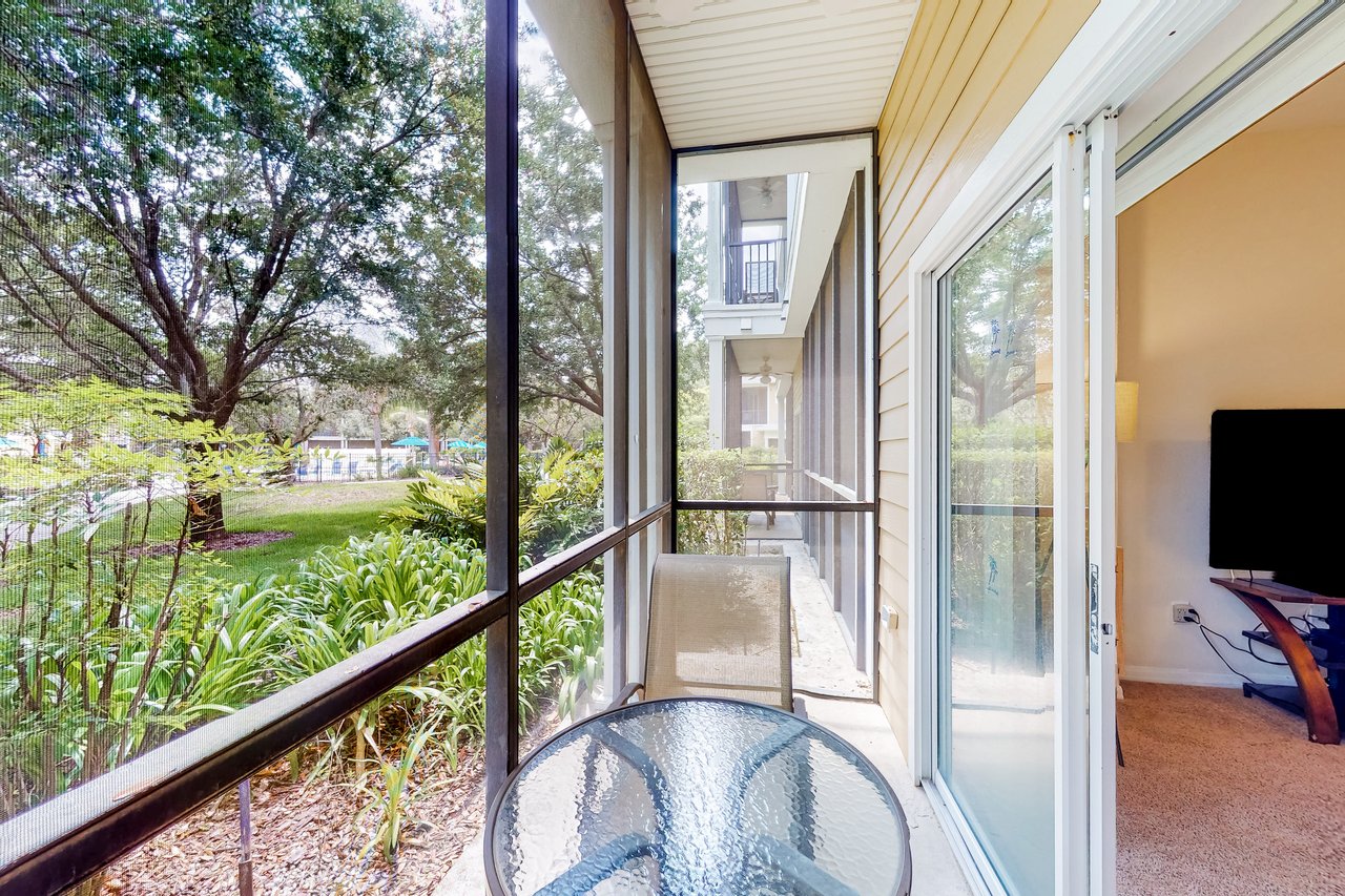 Enjoy meals in the well-equipped kitchen, which includes all major appliances, such as a refrigerator, oven, stove, and microwave, as well as cookware, utensils, and glassware. With plenty of room to spread out, you will love the spacious living room-dining room area and can take in the scenery from a screened balcony with tables and chairs. An in-home laundry room means you can wash clothes while watching cable TV in the living room or primary bedroom or while keeping an eye on the little ones in the crib and highchair included in the home.