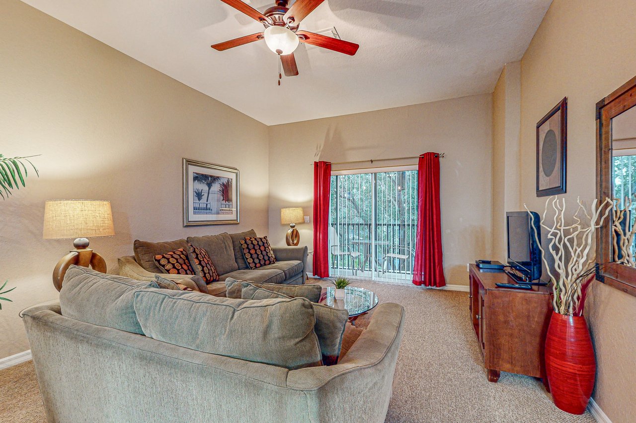 Boasting more than 1,200 square feet of space, the 3-bedroom Abacos villas at Bahama Bay Resort & Spa are ideal for family vacations or group getaways. Comfortable queen-sized beds are standard in the master bedroom and first guest bedroom, while the second guest bedroom features two twin beds. Additional sleeping space is available via a sleeper-sofa that opens up into a queen-sized bed in the living room. The Abacos villas feature two full bathrooms. Enjoy meals in the fully-equipped kitchen which includes all major appliances such as a refrigerator, oven, stove and microwave, and also includes cookware, utensils, and glassware. With plenty of room to spread out, guests will love the spacious living room-dining room area and can take in the scenery from a screened balcony with tables and chairs. An in-unit laundry room means guests can wash clothes while watching cable TV in the living room or master bedroom, or while keeping an eye on the little ones in the crib and highchair included in each unit. What's nearby: The Bahama Bay Resort & Spa boasts amenities like shared pools, hot tubs, fitness center, and a sauna. Located on the shores of Old Lake Davenport, you can enjoy the sand beach, view wildlife from the pier, or relax in a hammock. The resort is also conveniently located near Polo Park East Golf Course. Located only 10 miles from Walt Disney World, there are plenty of local dining and shopping options nearby. Disney Springs offers over 100 shops and 60 restaurants along with daily and nightly entertainment. Gatorland has a free-flight aviary, petting zoo, animal shows, zip line, and a new Stompin' Gator Off-Road Adventure. For additional entertainment, Sea World is just 16 miles away, Universal Studios is 22 miles and for the younger guests, Legoland Florida is 23 miles away from the resort. The Tradewinds Restaurant and Bar, located within the resort, is located poolside on the shore of Lake Davenport. With both indoor and outdoor seating, as well as a bar with lake views, guests can enjoy ice cold drinks, signature burgers and fries, and more! The Market Place, located in the main Clubhouse, offers a wide selection of items from sundries and necessities to souvenirs, apparel, gifts, drinks, snacks, ice cream, and accessories. Things to know: Free WiFi Full Kitchen Please note: All shared amenities are open and operating under limited capacity and new operating hours. Specific information will be provided after booking. Outdoor parking is available at no charge. Motorcycles are permitted but may not remain on a trailer. Trailers of any kind, RVs, and jet skis are not allowed. Commercial or logo-marked vehicles are also prohibited unless they are actively providing service or making a delivery.