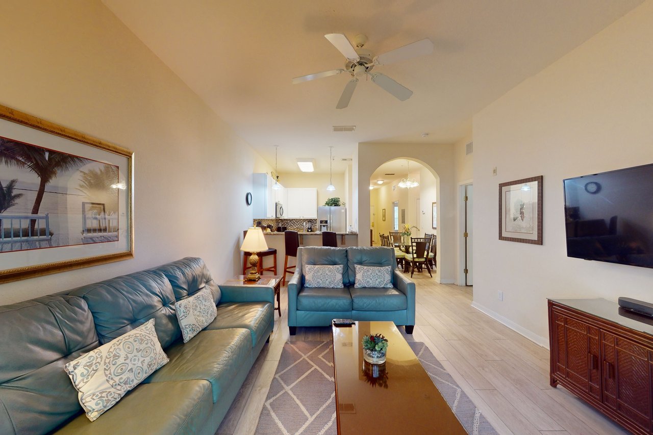 Boasting more than 1,200 square feet of space, the 3-bedroom Abacos villas at Bahama Bay Resort & Spa are ideal for family vacations or group getaways. Comfortable queen-sized beds are standard in the master bedroom and first guest bedroom, while the second guest bedroom features two twin beds. Additional sleeping space is available via a sleeper-sofa that opens up into a queen-sized bed in the living room. The Abacos villas feature two full bathrooms. Enjoy meals in the fully-equipped kitchen which includes all major appliances such as a refrigerator, oven, stove and microwave, and also includes cookware, utensils, and glassware. With plenty of room to spread out, guests will love the spacious living room-dining room area and can take in the scenery from a screened balcony with tables and chairs. An in-unit laundry room means guests can wash clothes while watching cable TV in the living room or master bedroom, or while keeping an eye on the little ones in the crib and highchair included in each unit.