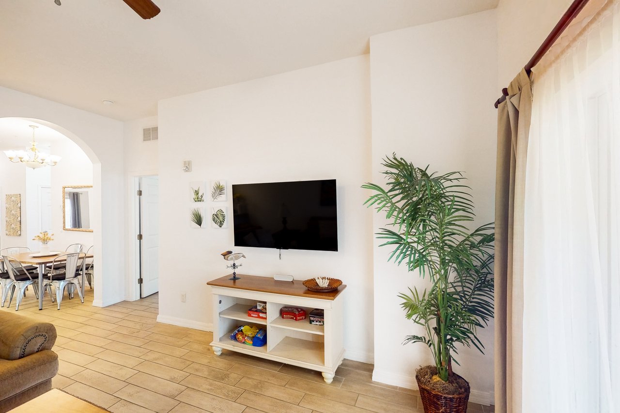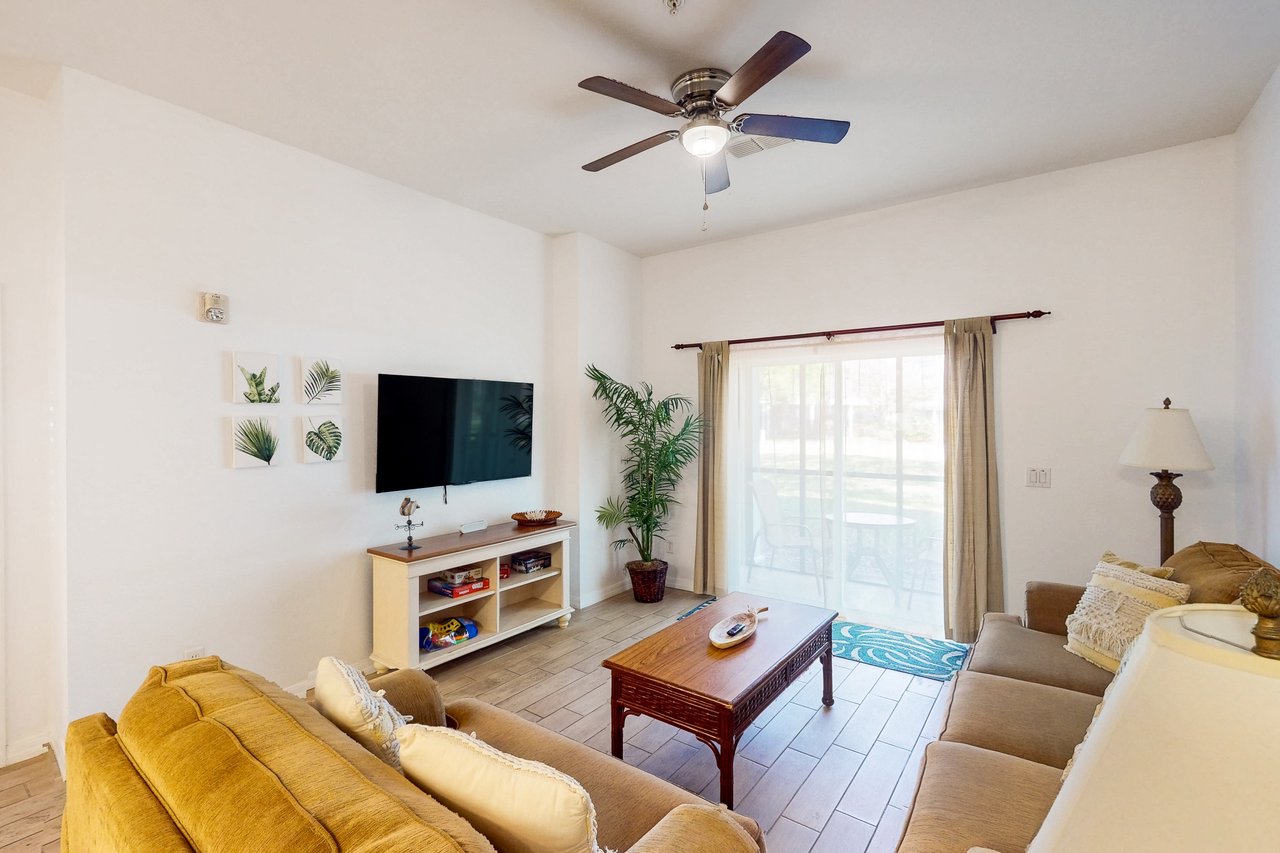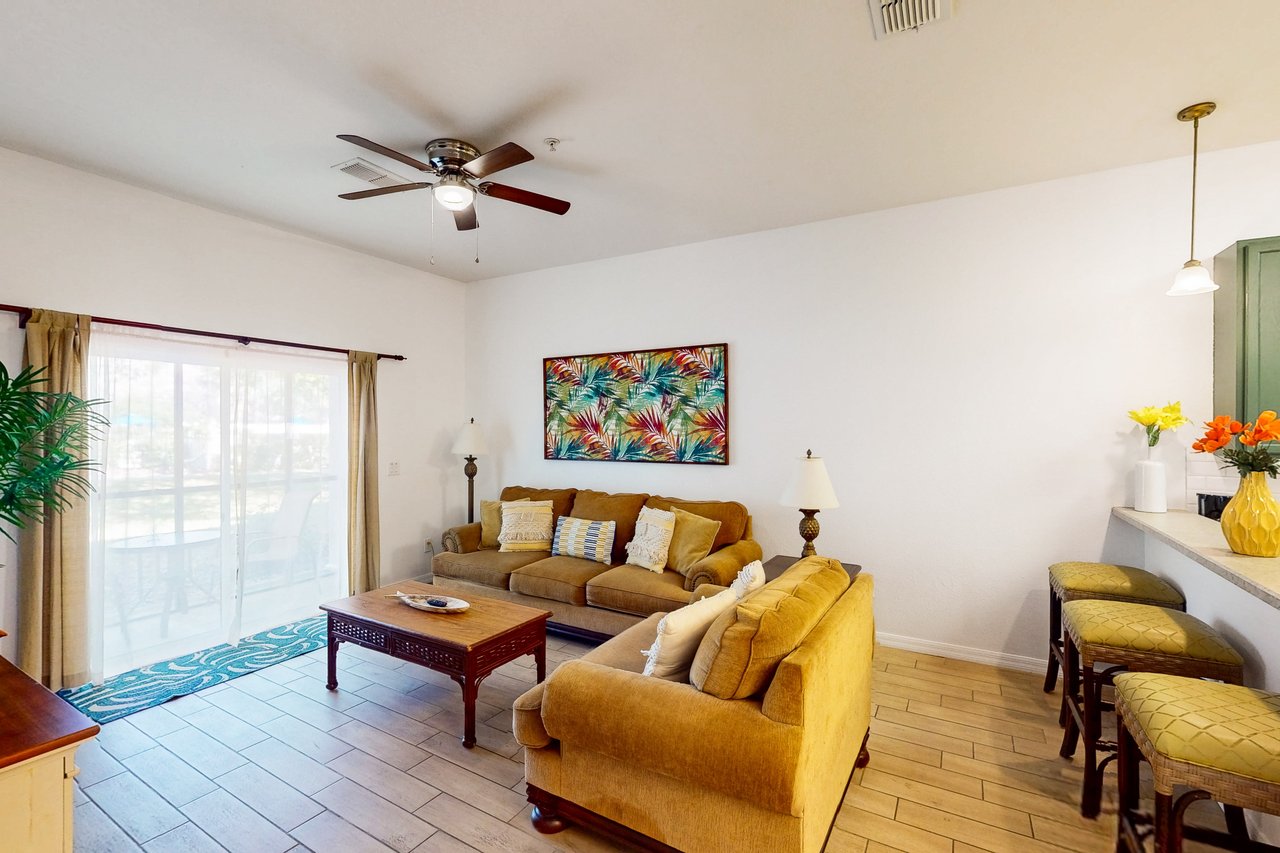 Boasting more than 1,200 square feet of space, the 3-bedroom Abacos villas at Bahama Bay Resort & Spa are ideal for family vacations or group getaways. Comfortable queen-sized beds are standard in the master bedroom and first guest bedroom, while the second guest bedroom features two twin beds. Additional sleeping space is available via a sleeper-sofa that opens up into a queen-sized bed in the living room. The Abacos villas feature two full bathrooms. Enjoy meals in the fully-equipped kitchen which includes all major appliances such as a refrigerator, oven, stove and microwave, and also includes cookware, utensils, and glassware. With plenty of room to spread out, guests will love the spacious living room-dining room area and can take in the scenery from a screened balcony with tables and chairs. An in-unit laundry room means guests can wash clothes while watching cable TV in the living room or master bedroom, or while keeping an eye on the little ones in the crib and highchair included in each unit. What's nearby: The Bahama Bay Resort & Spa boasts amenities like shared pools, hot tubs, fitness center, and a sauna. Located on the shores of Old Lake Davenport, you can enjoy the sand beach, view wildlife from the pier, or relax in a hammock. The resort is also conveniently located near Polo Park East Golf Course. Located only 10 miles from Walt Disney World, there are plenty of local dining and shopping options nearby. Disney Springs offers over 100 shops and 60 restaurants along with daily and nightly entertainment. Gatorland has a free-flight aviary, petting zoo, animal shows, zip line, and a new Stompin' Gator Off-Road Adventure. For additional entertainment, Sea World is just 16 miles away, Universal Studios is 22 miles and for the younger guests, Legoland Florida is 23 miles away from the resort. The Tradewinds Restaurant and Bar, located within the resort, is located poolside on the shore of Lake Davenport. With both indoor and outdoor seating, as well as a bar with lake views, guests can enjoy ice cold drinks, signature burgers and fries, and more! The Market Place, located in the main Clubhouse, offers a wide selection of items from sundries and necessities to souvenirs, apparel, gifts, drinks, snacks, ice cream, and accessories. Things to know: Free WiFi Full Kitchen Please note: All shared amenities are open and operating under limited capacity and new operating hours. Specific information will be provided after booking. Outdoor parking is available at no charge. Motorcycles are permitted but may not remain on a trailer. Trailers of any kind, RVs, and jet skis are not allowed. Commercial or logo-marked vehicles are also prohibited unless they are actively providing service or making a delivery.