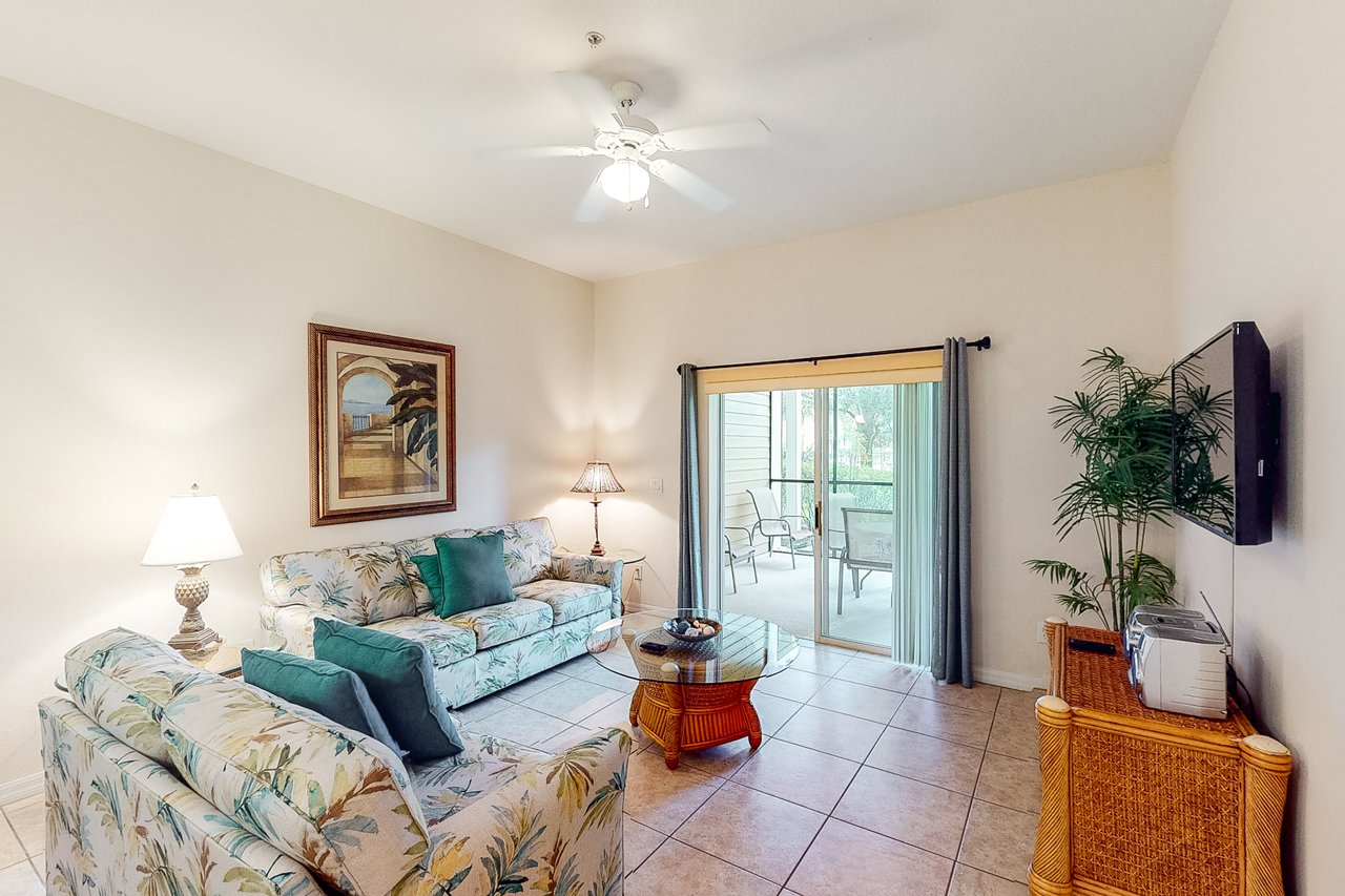The Andros is our plus-sized 2-bedroom villa boasting nearly 1,400 square feet of livable space and amazing architectural details like vaulted ceilings throughout. The Andros includes a king-sized bed in the master bedroom, two twin beds in the guest bedroom and a sofa in the living room that opens into a queen-sized bed. Available with laminate flooring or full carpet throughout, our Andros villa is perfect for vacationers who have children. The Andros has a crib, a highchair, and two full bathrooms - the master bath has dual sinks, separate showers, and a tub. It also features a large and fully-equipped kitchen which has all major appliances and includes crockery, cookware, utensils, and glassware so you can stay in and have family meals in the dining area. Enjoy coffee, drinks and the views from one of your two screened balconies. Or, stretch out in the spacious living area and enjoy cable TV while washing clothes in the in-unit laundry room. What's nearby: The Bahama Bay Resort & Spa boasts amenities like shared pools, hot tubs, fitness center, and a sauna. Located on the shores of Old Lake Davenport, you can enjoy the sand beach, view wildlife from the pier, or relax in a hammock. The resort is also conveniently located near Polo Park East Golf Course. Located only 10 miles from Walt Disney World, there are plenty of local dining and shopping options nearby. Disney Springs offers over 100 shops and 60 restaurants along with daily and nightly entertainment. Gatorland has a free-flight aviary, petting zoo, animal shows, zip line, and a new Stompin' Gator Off-Road Adventure. For additional entertainment, Sea World is just 16 miles away, Universal Studios is 22 miles and for the younger guests, Legoland Florida is 23 miles away from the resort. The Tradewinds Restaurant and Bar, located within the resort, is located poolside on the shore of Lake Davenport. With both indoor and outdoor seating, as well as a bar with lake views, guests can enjoy ice cold drinks, signature burgers and fries, and more! The Market Place, located in the main Clubhouse, offers a wide selection of items from sundries and necessities to souvenirs, apparel, gifts, drinks, snacks, ice cream, and accessories. Things to know: Free WiFi Full Kitchen Please note: All shared amenities are open and operating under limited capacity and new operating hours. Specific information will be provided after booking. Outdoor parking is available at no charge. Motorcycles are permitted but may not remain on a trailer. Trailers of any kind, RVs, and jet skis are not allowed. Commercial or logo-marked vehicles are also prohibited unless they are actively providing service or making a delivery.