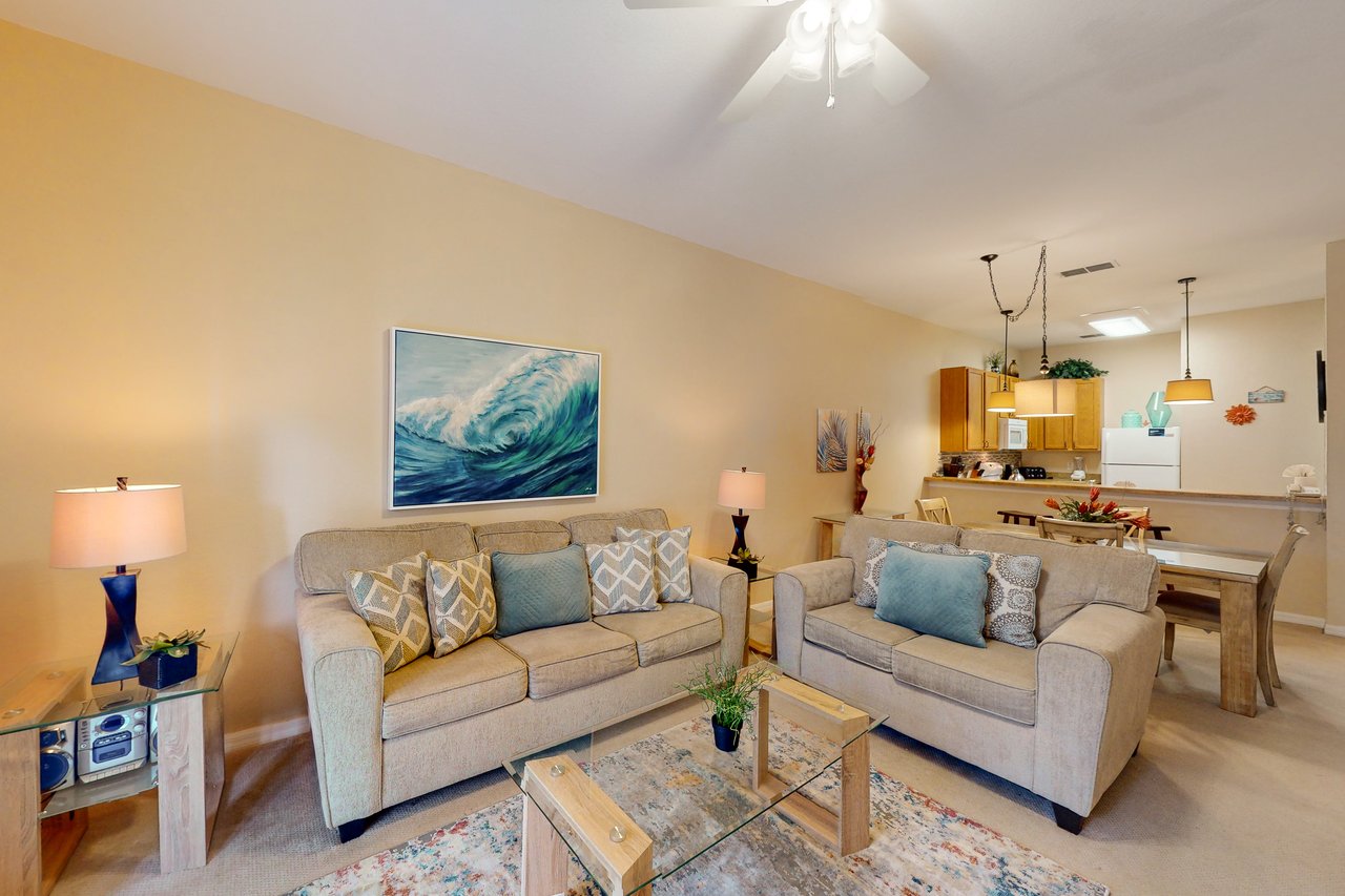 Blending comfort and value, this two-bedroom condo provides 1,116 square feet of space and enticing extras such as an in-home laundry room, a private screened balcony, and vaulted ceilings. This vacation rental includes a crib and a high chair, perfect for vacationers with children. The large, well-equipped kitchen has all the major appliances plus crockery, cookware, utensils, and glassware, so you can stay in and have family meals in the dining area. Stretch out with some cable TV on the sofa bed in the spacious living area after a fun-filled day.