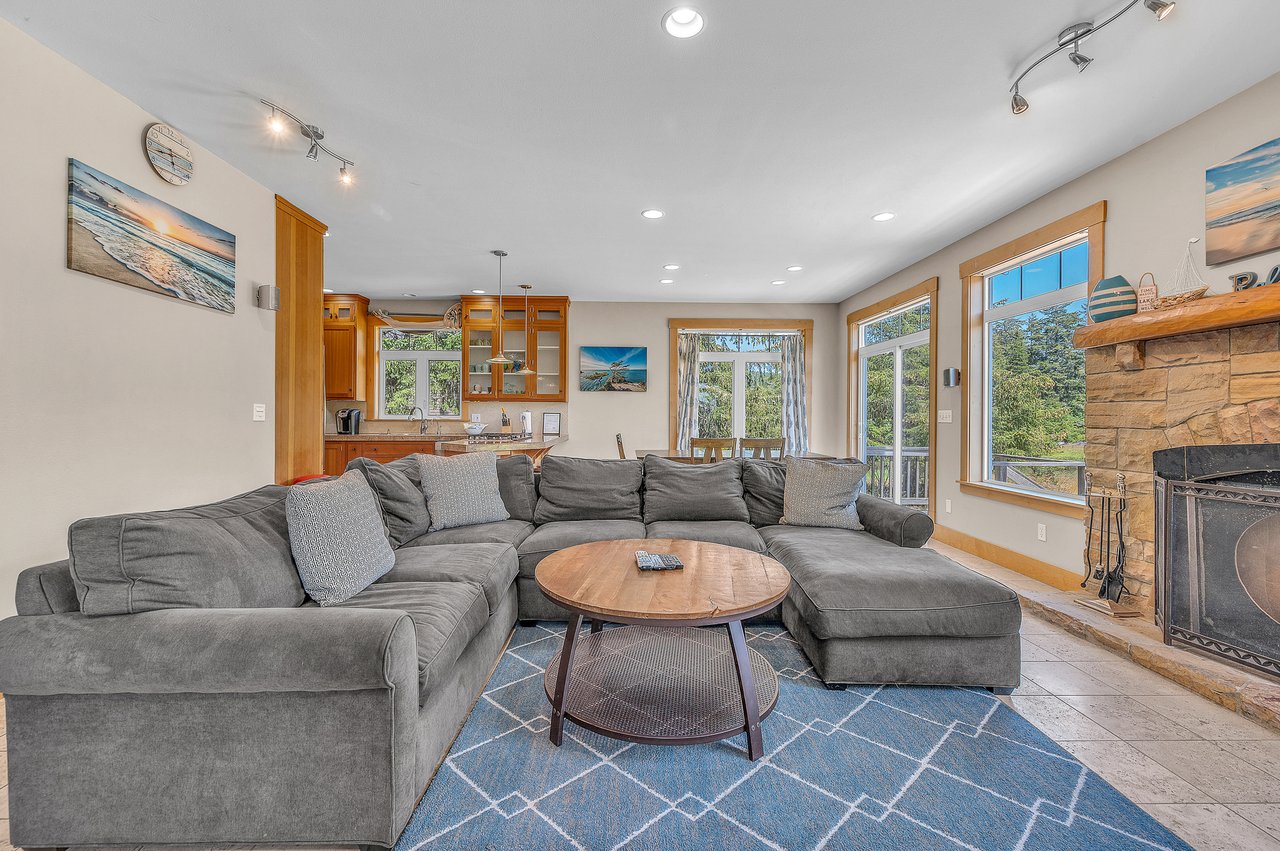 Step inside onto the heated floors, and you'll find yourself in the living room filled with plenty of seating for all of your guests, along with gorgeous riverfront views from the bay windows. Gather around after a long day of exploring the coastline, and warm up by the fire or relax with a movie and popcorn. The kitchen is adjacent to the living room, making it easy to cook a meal while spending time with your family and friends. You'll have everything you need to whip up some quick and easy meals while on your trip, or feel free to eat out at one of the many restaurants located in the Lincoln City area, including Mo's and Highway 101 Burger. The dining room table offers room for most of your guests to eat together, or feel free to lounge on the couch. You could even head out onto the back deck and enjoy your meal in the sunshine. This home offers a washer and dryer for guest use, so feel free to pack lightly!