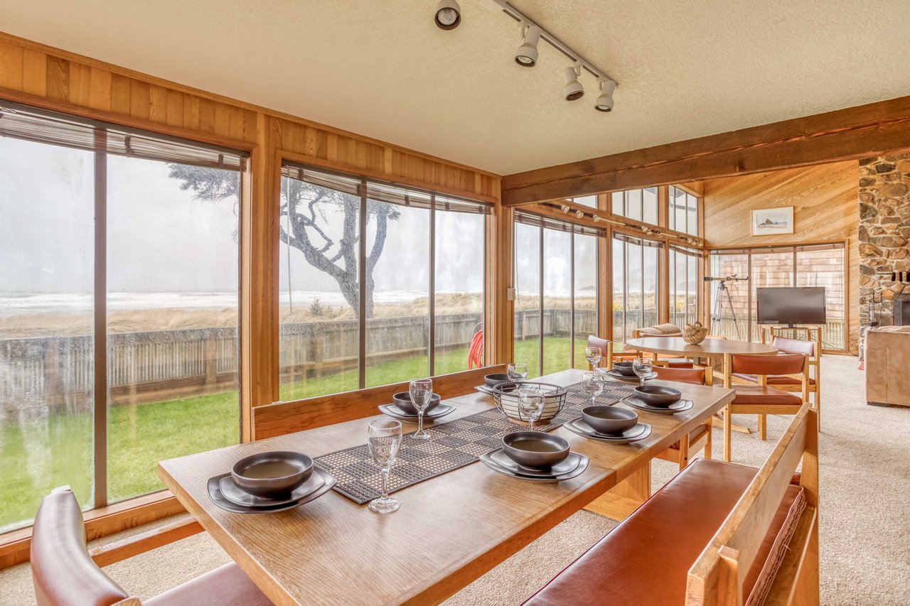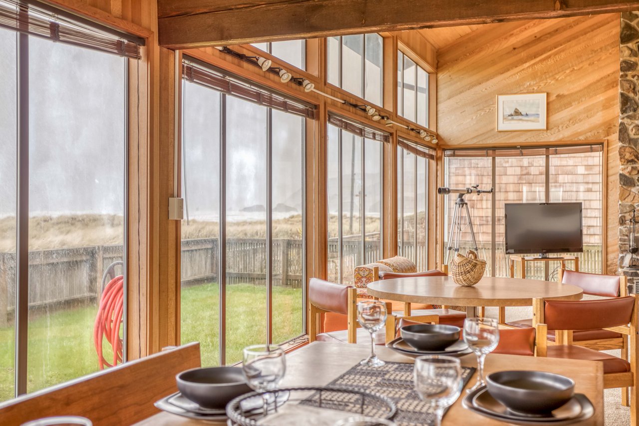 This unique home plants you directly in front of the vast expanse of Cannon Beach and the Ecola River estuary, with direct access to the beach through a gate in the front-yard fence. Custom built in the 70’s, Sea Bright retains all of the natural beauty designed into its open space: cedar-lined walls and vaulted ceiling, a soaring stone hearth, a two-story wall of windows for loads of ocean light, and fantastic, ocean-view spaces for gathering. The home can accommodate plenty of guests with five bedrooms, including a two-twin, two-trundle sleeping room that the kids will love to have to themselves. One bedroom is on the main floor for accessibility; the Primary bedroom (with a shared bath) is upstairs, with stupendous views of Haystack Rock and chairs for ocean-gazing. It’s hard to imagine a better place to share space with family or friends—the home’s perfect location near both the beach and downtown gives your guests plenty of options to explore all of Cannon Beach on foot, whether they want to beachcomb or comb the shops for treats. Staying home means napping in the sunlight flooding the living room, curling up in front of a wood fire, grilling outdoors in a sea breeze, or starting a ping-pong championship in the garage. Once you’ve enjoyed a stay in this stunning yet easy-going home, you and your guests will be searching the calendar for more time for Sea Bright in the future.