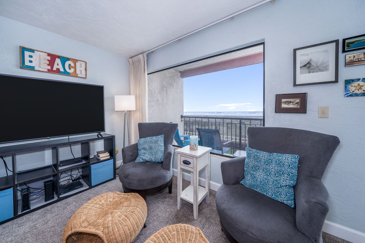 Step inside this quaint beach-themed unit for a relaxing vacation on the Oregon coast. The living room is beautifully decorated in blues and corals for a real beach feeling. A flatscreen TV with a DVD player is included for entertainment when the weather isn't cooperative. There is also a private back deck included in this unit, just step outside and enjoy your oceanfront view of the Pacific Ocean and the Seaside boardwalk! A dining room table seats four, with more room located at the kitchen counter, complete with barstools. The kitchen has everything you need to whip up a quick and easy homemade meal. Head down the hallway, and you'll find the bedroom, complete with a queen bed and another flatscreen TV. The sleeper sofa and a queen Murphy bed are available in the living room. One bathroom offers a walk-in shower, while the other has a tub/shower combo. Head downstairs, and take a walk on the Prom down to the Seaside shops and restaurants, or relax and watch a beautiful sunset on the beach with your family. It doesn't get any better than here in Seaside! Come explore the Oregon coast today at Seaside Beach Club #203!