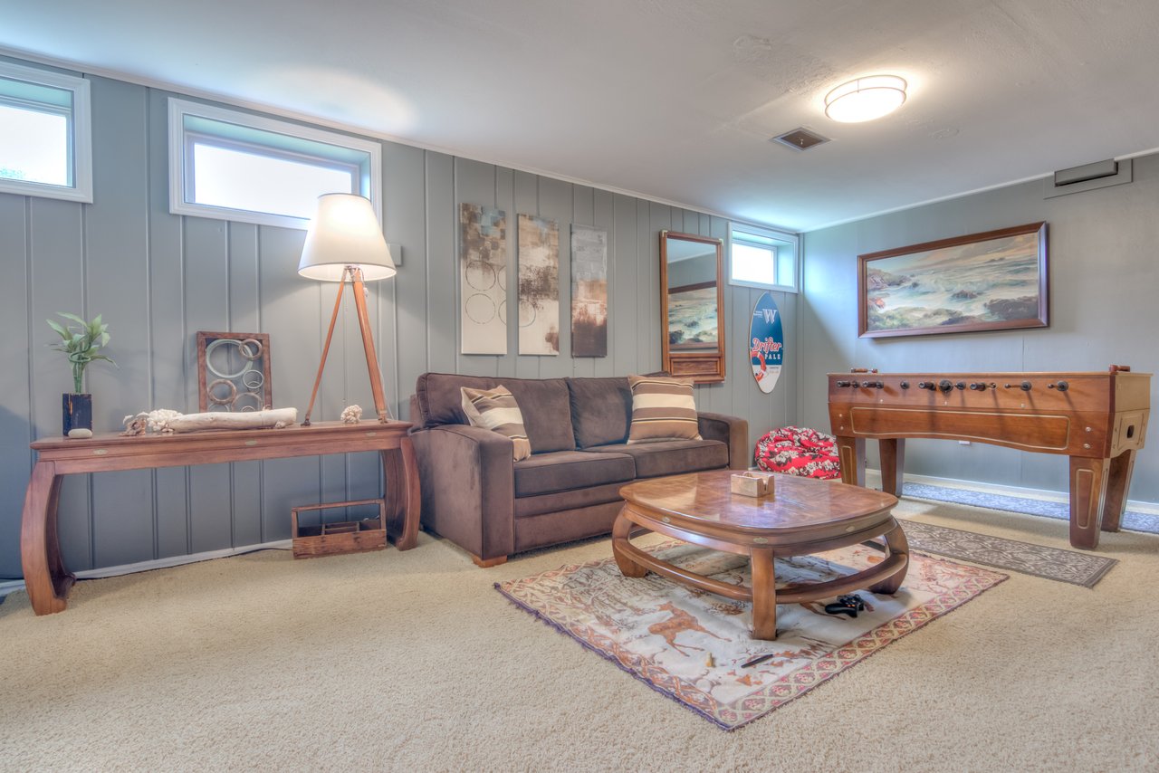 With five bedrooms, you can invite plenty of guests, with a queen bedroom on the main level for easy access and an ocean-view king suite and two queen bedrooms upstairs. The kids will adore the bunk bed with its built-in ladder and porthole, but they’ll also gravitate to the lower level, which has a bonus room with a kitchenette, TV, foosball, electronic instruments, DVD collection, gaming system, an exercise bike.
