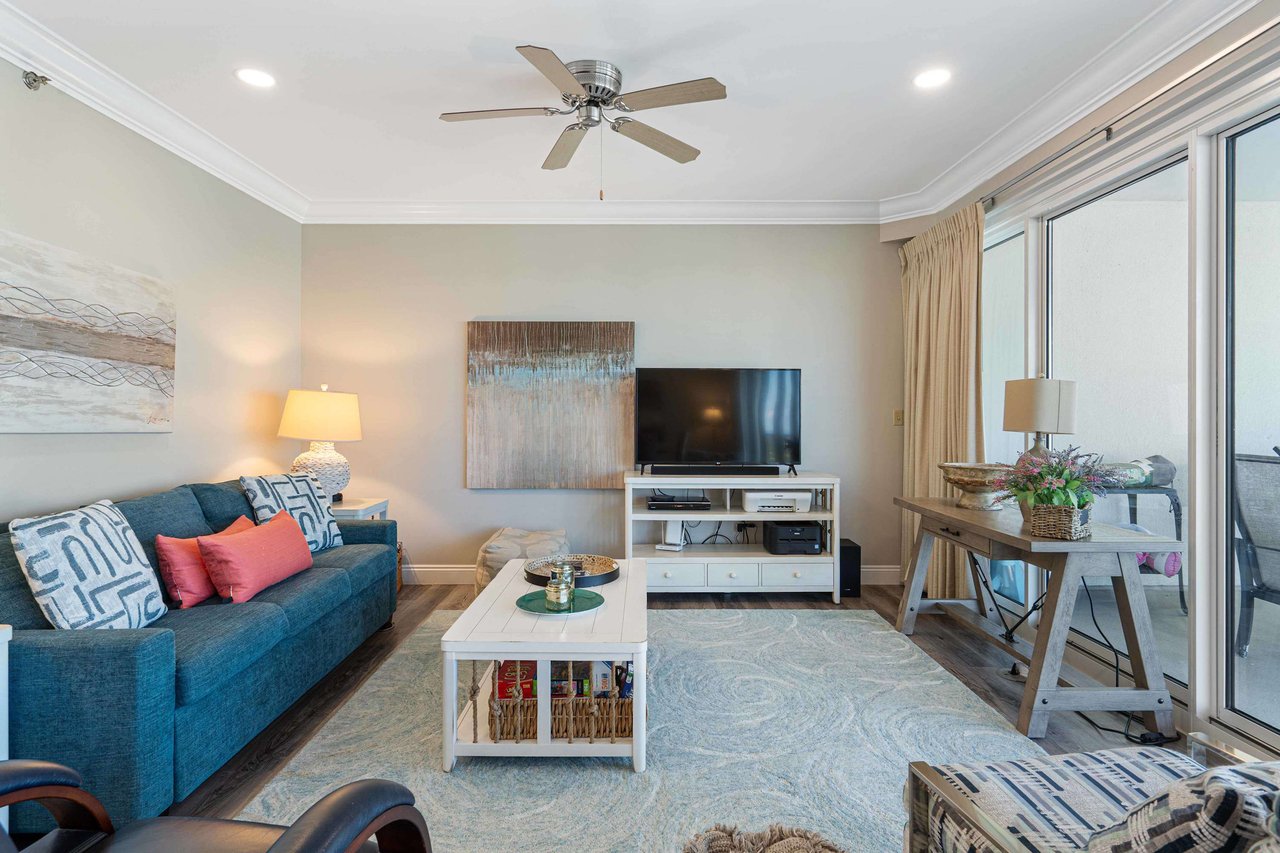 Step inside to a warm, welcoming interior designed for connection and relaxation. The full kitchen is well equipped with stainless steel appliances and a breakfast bar, making it easy to prep everything from quick beach-day snacks to dinner at home. Gather around the dining table for shared meals, laughter, and game nights, then unwind in the comfortable living area with easy balcony access, your front-row seat to breezy mornings and glowing sunsets.