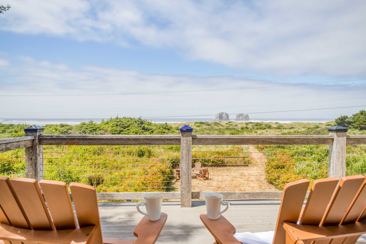 Prepare for a fabulous Rockaway Beach stay at Twin Rocks Retreat, a gorgeous oceanfront two-story nestled in a stand of Douglas firs with a view over a sea-grass meadow to Twin Rocks and the Pacific Ocean. With two upstairs king bedrooms, a twin bedroom, and a lower-level double queen, this spacious home lets you invite lots of guests to join your coastal holiday retreat. Adirondack chairs invite you to take in the view on the outdoor deck, and a sandy trail leads right out of your backyard to the beach. Inside, you’ll enjoy sleek hardwood flooring, comfortable seating, and a fireplace for cozy evenings, with large windows to the sea. Dine with an ocean view from the dining area; even working in the fully equipped kitchen lets you gaze at the western horizon over a quartz breakfast bar with seating for three. If you prefer to dine outdoors, a picnic table and barbecue sit on the deck; chairs and a fire pit for s’mores beckon from down on the sand.