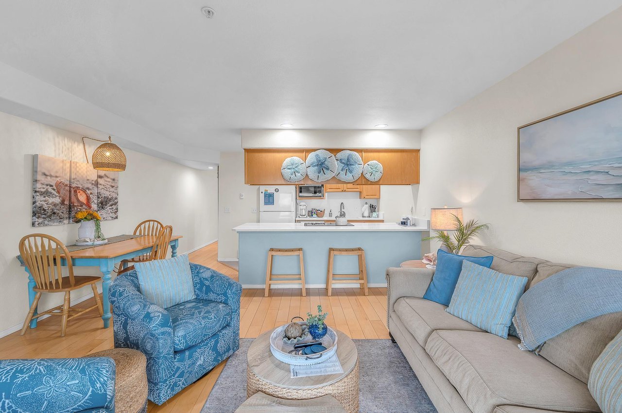 Welcome to Waters Edge 108 - Blue Chair Bay, your dream oceanfront getaway in Lincoln City. Nestled in the historic Taft District of Lincoln City, this stunning condo offers an unparalleled beach experience with its prime ocean-front location. As you step inside, you’re greeted by a spacious, open-concept living area featuring modern decor and plenty of natural light, creating a warm and inviting atmosphere. The living room seamlessly flows into a dining area, perfect for enjoying meals while taking in the breathtaking ocean views from the large bay windows.