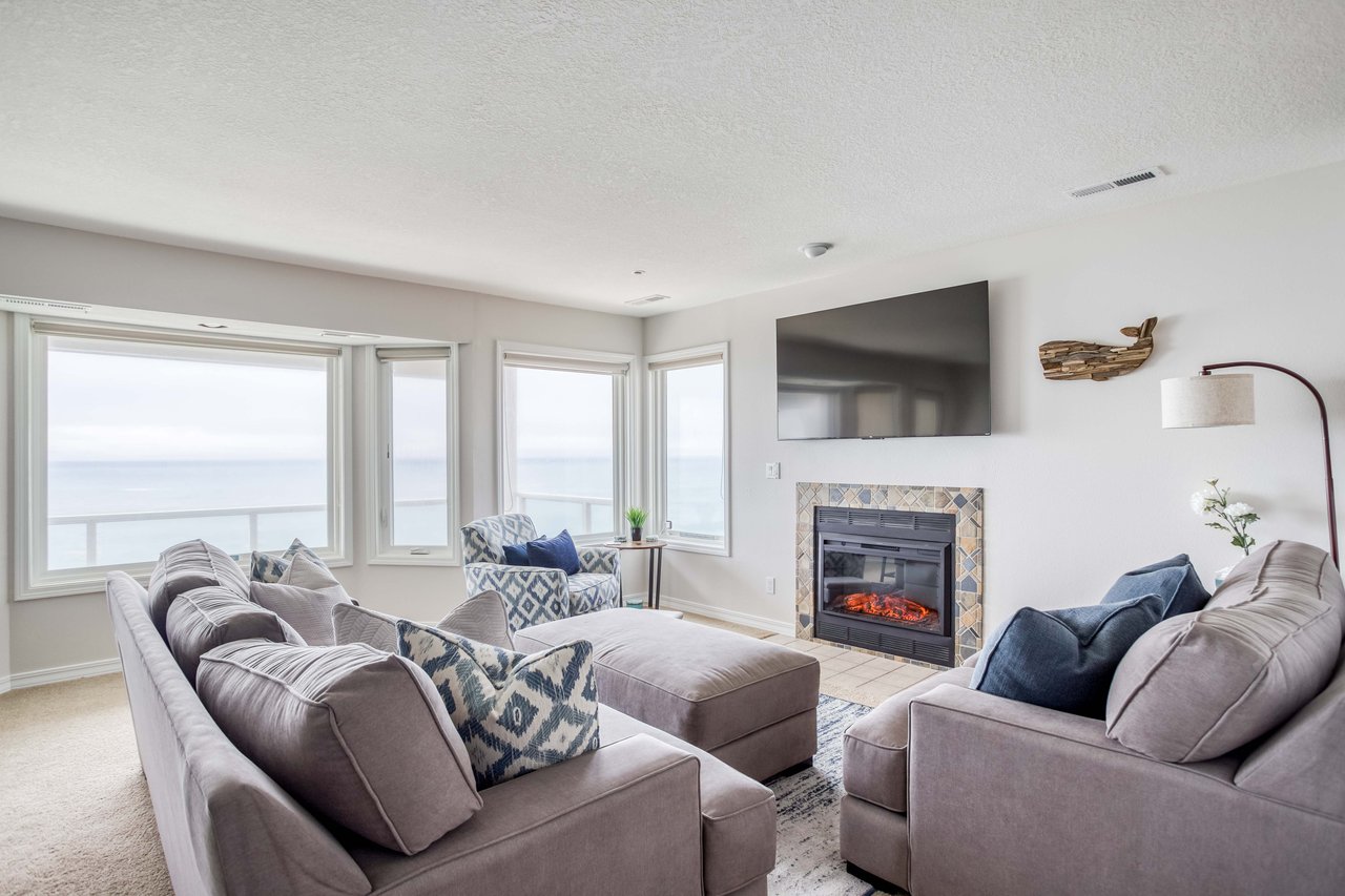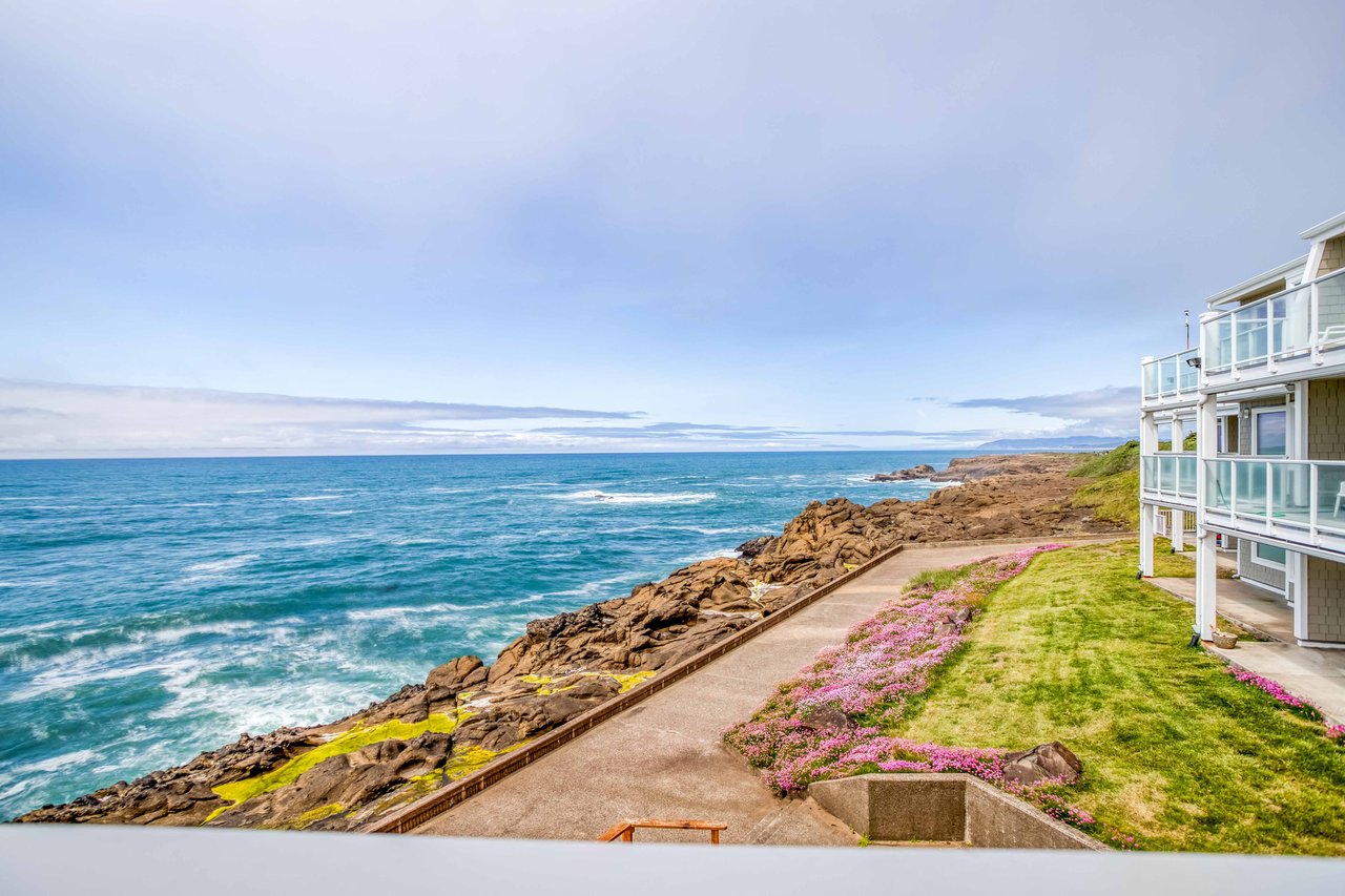 Perched on a basalt outcropping just north of downtown Depoe Bay, Whale Watchers Getaway looks down at surging ocean waves studded with seabirds, and if you’re lucky, whale spouts! Located above a kelp forest where migrating and resident whales like to feed, this elegant 2nd-floor condo will keep your eyes on the ocean as cormorants, pelicans, and gulls sweep past. Relax in front of large windows in the soothing living room, newly furnished with Oregon-made Stanton sofas, a Roku TV, and a warm electric fireplace. The dining table has an ocean view, and it’s easy to eat in from the fully equipped kitchen with quartz counters, a breakfast bar, stainless-steel appliances, and a window that looks north up the coastline to Boiler Bay. A king suite includes a recliner and TV, plus a spa-like bath with a walk-in shower. The second bedroom is furnished with two twin beds, a TV, and a window to the sea. This thoughtfully outfitted home includes some wonderful extras: a portable hammock for two; two patio chairs, a portable outdoor table, and outdoor pillows and blankets for the balcony; loads of extra blankets, floor fans, games, puzzles, and even an office desk and chair. An easy extension hose lets you spray salt from the balcony windows for the perfect view. Spend the day watching passing whales and the evenings with breathtaking sunsets.