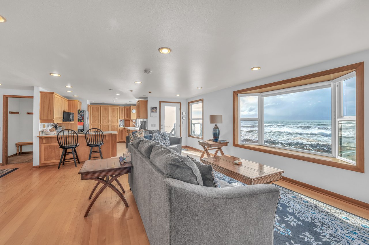 Dramatic oceanfront views await, offering a front-row seat to crashing waves on the basalt rocks from this two-bedroom home. Oceanfront from almost every room, this home is named for Wiley the cat, who loves the ocean view! The main level is designed for effortless comfort and accessibility and features an oceanfront bedroom with attached bath on the main level, providing a serene first bedroom complete with an en suite bathroom. Nearby, the open-concept floor plan includes hardwood floors and a large, well-appointed kitchen, allowing you to whip up a local seafood feast while keeping the white-capped waves in constant sight. Whether you’re preparing a meal or enjoying a quiet morning, the sound of the Pacific provides the perfect natural soundtrack.